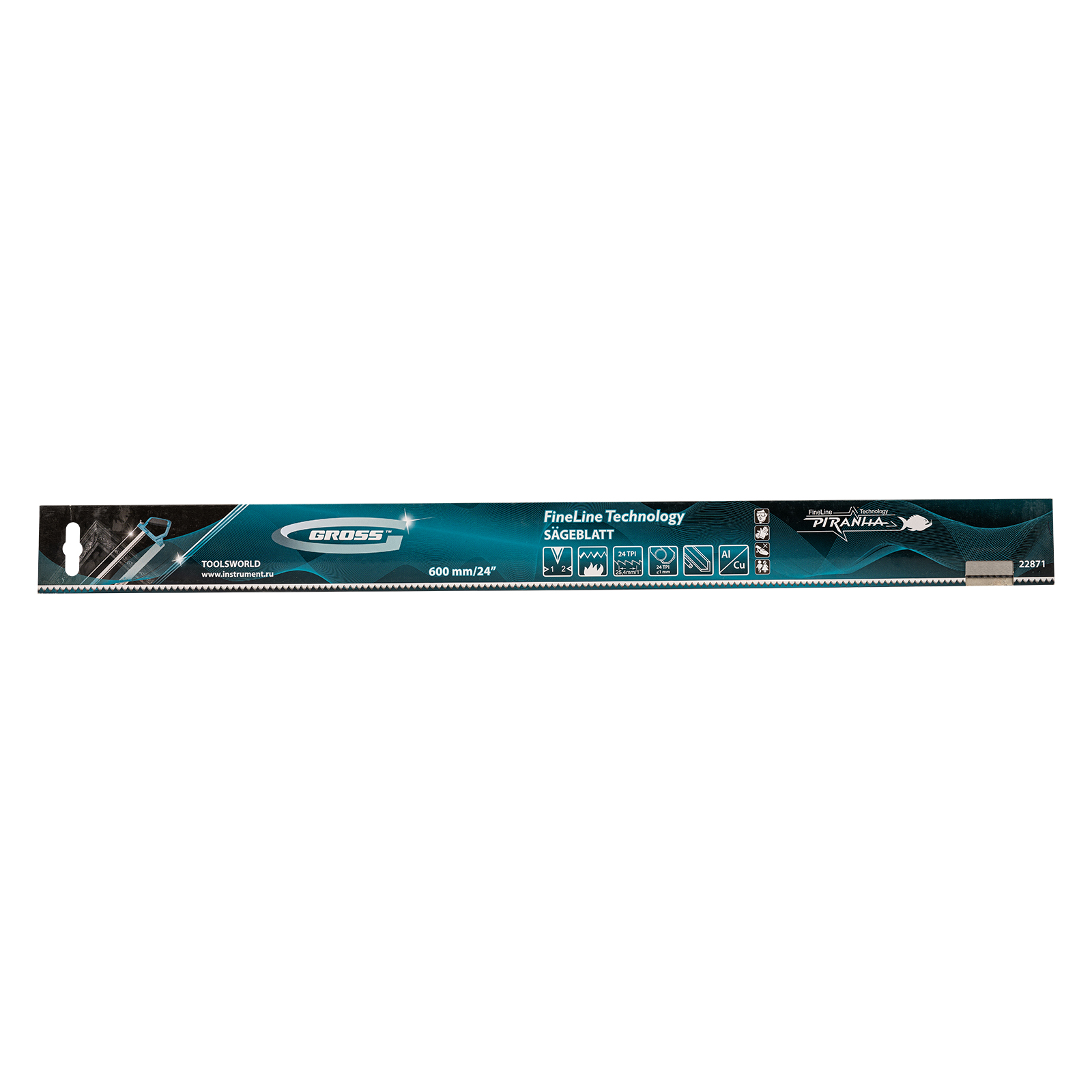 Пильное полотно Gross «PIRANHA» 22871 длиной 600 мм, с каленым зубом с 2D-заточкой, 24 TPI — режущий элемент для прецизионного стусла, применяемый для распила под углом заготовок из дерева, мягкого металла и пластика. Мелкие зубья с шагом 24 TPI позволяют получить точный и чистый рез. Полотно используется для пиления плинтусов, реек, дверных наличников и других деталей.