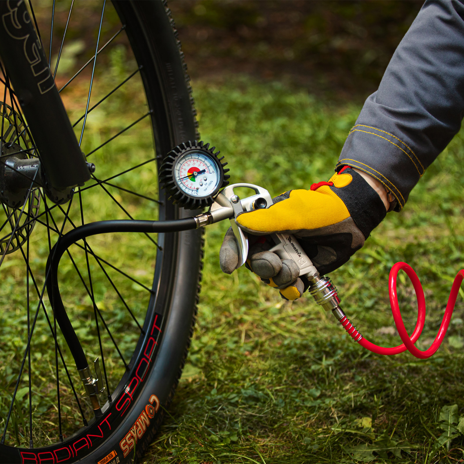 - Контроль параметров работы — 2 шкалы на манометре (Пси и Бар) позволяют отслеживать и регулировать давление в шинах.