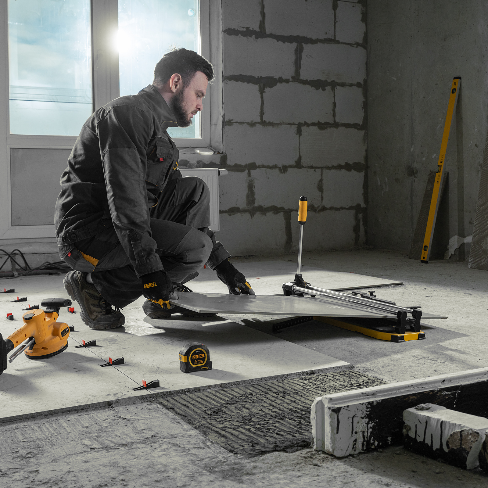 Ручной плиткорез Denzel 877008 с цельнометаллическими направляющими и стальной станиной, с кареткой на подшипниках и рукояткой-пеналом, предназначен для прямой и диагональной резки керамической плитки и керамогранита длиной до 600 мм и толщиной до 14 мм. Раздвижные упоры упрощают работу с плиткой большого размера. Инструмент используется для проведения отделочных работ.