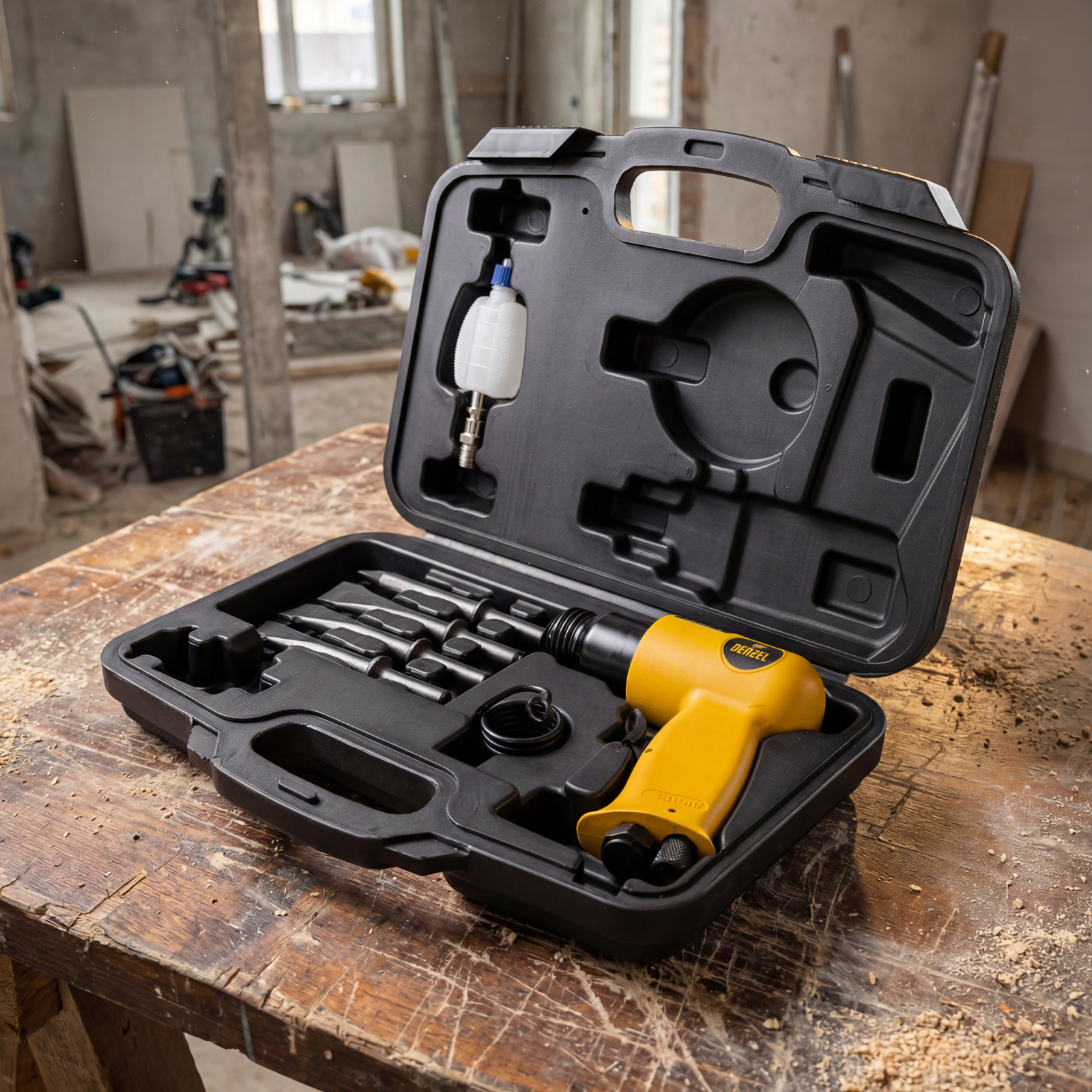 Молоток - 1 штШтуцер - 1 штКейс - 1 штЗубило - 4, Масленка - 1 штПружина-держатель - 1 штКейс - 1 шт |