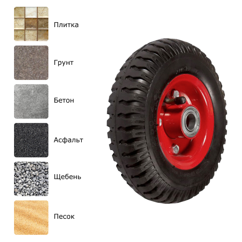 Грузоподъемность данного пневматического колеса составляет 170 кг, диаметр — 255 мм. Модель отличается высокой проходимостью, может использоваться на рыхлых неровных поверхностях (песок, щебень и т. п.), подходит для строительных и садовых тачек.