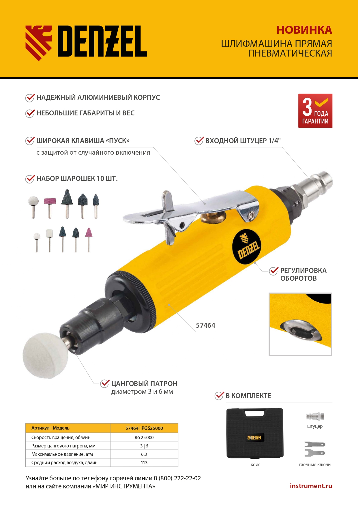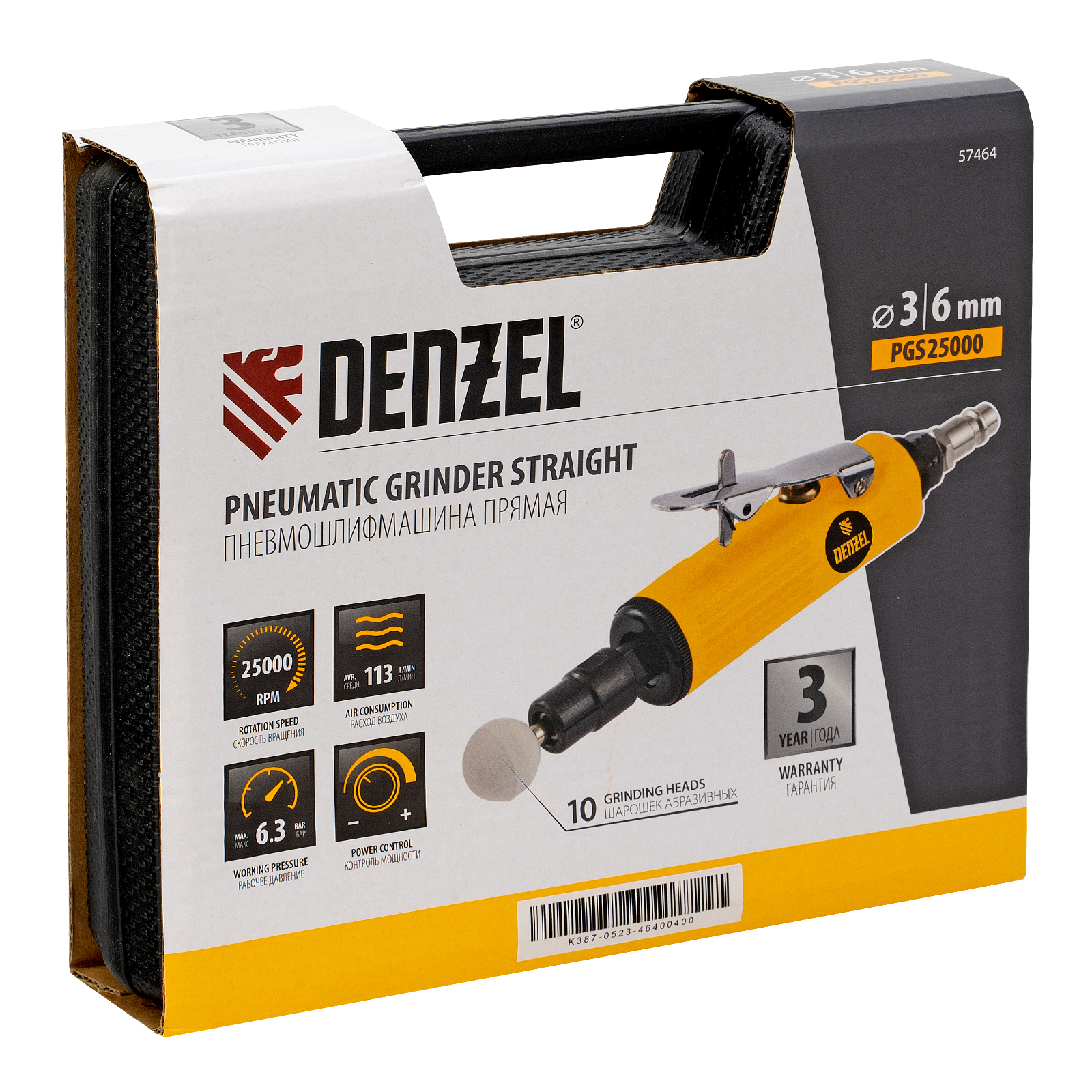 Пневмошлифмашина прямая PGS25000, 25000 об/мин, 10 шлиф. камней, цанга - 3, 6 мм, 113 л/мин Denzel в Екатеринбурге