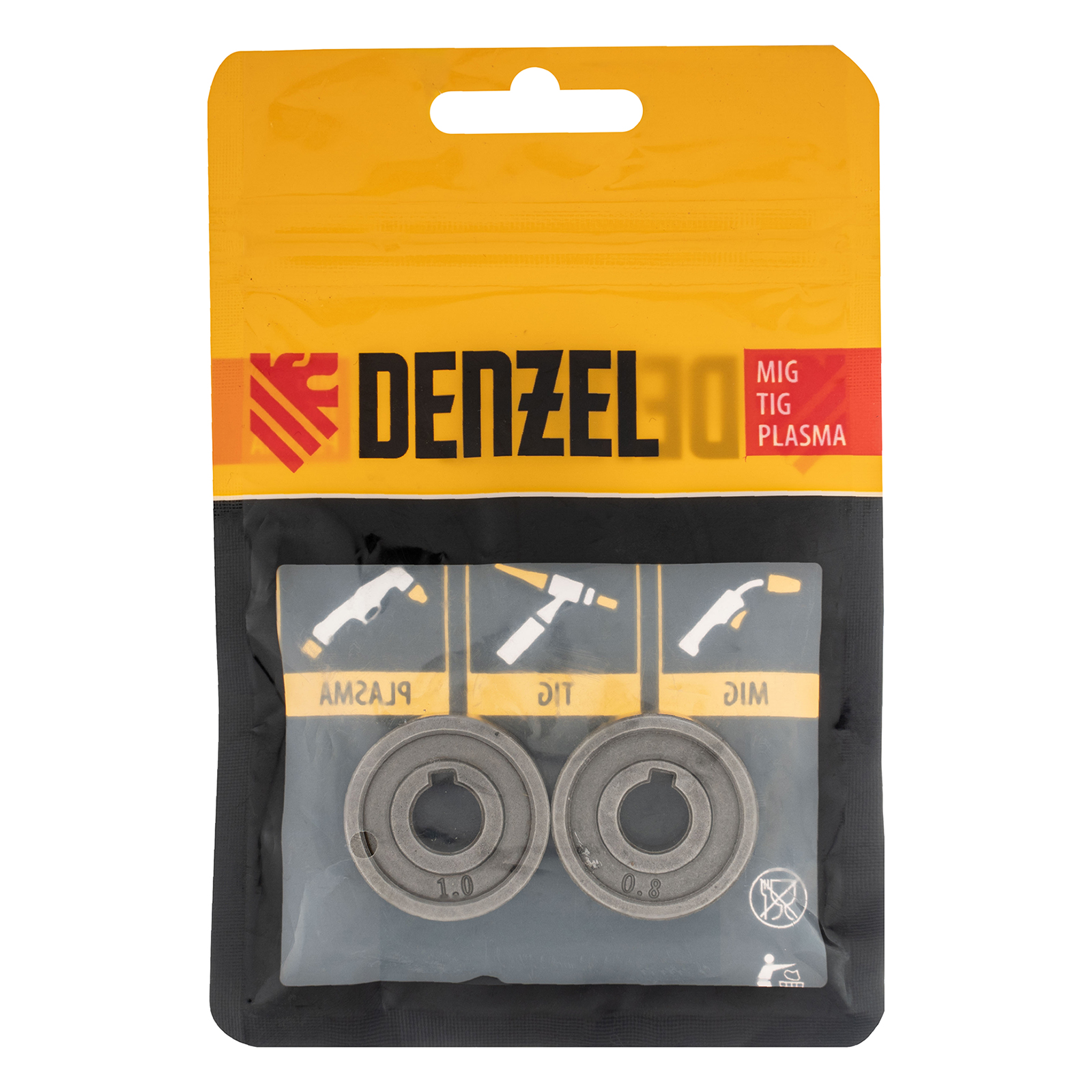 Подающий ролик Denzel 93650 с V-профилем, 2 шт. в упаковке, — элемент конструкции сварочного аппарата, предназначенный для протягивания стальной проволоки диаметром 0,8-1 мм. Совместим с моделями Denzel 94313, 94314, 94361, а также со сварочными полуавтоматами других торговых марок.