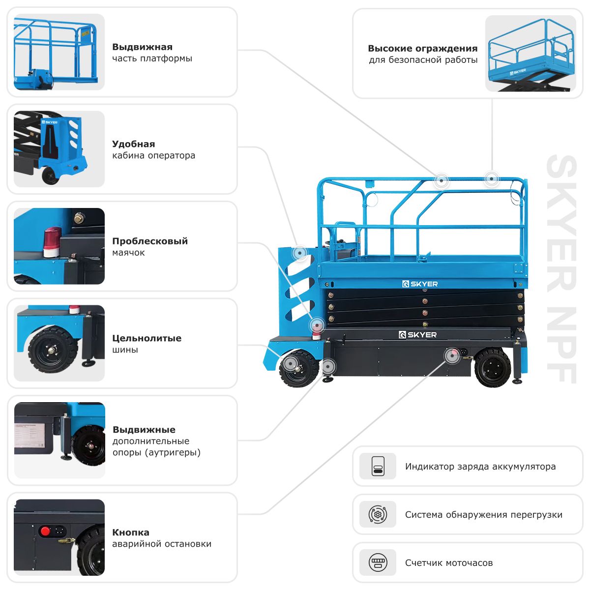 Подъемник NPF1105 — профессиональное решение для тех, кто ценит комфорт, безопасность и автономность при работе на высоте.