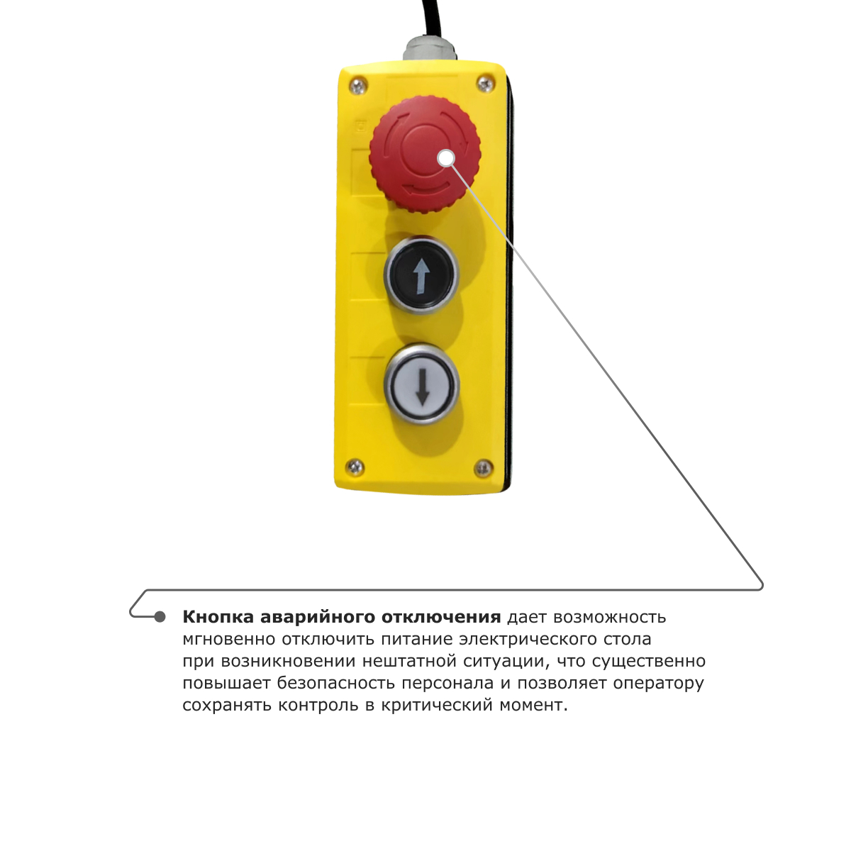 Подъемный стол соответствует европейскому стандарту безопасности EN 1570, имеет мощную конструкцию, хромированные поршни и цилиндр высокого давления с функцией безопасности.