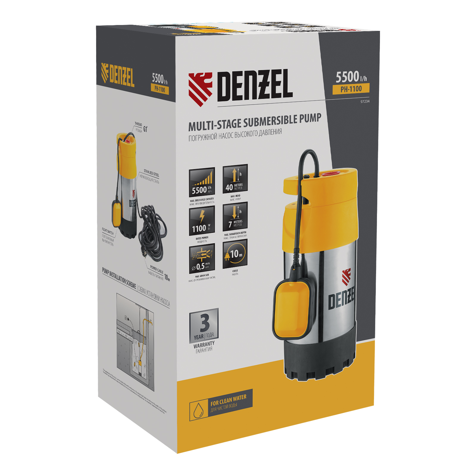 Погружной насос высокого давления PH1100, 1100Вт, подъем 40м, 5500 л/ч Denzel в Екатеринбурге