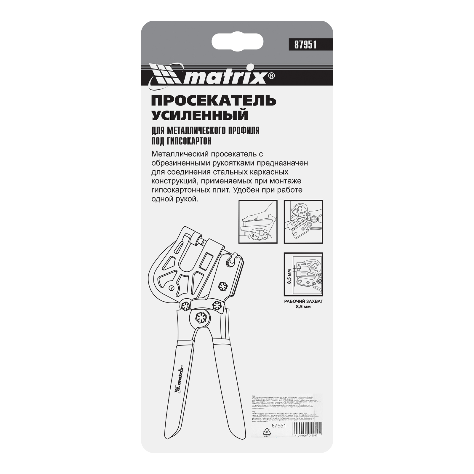 Просекатель Matrix 87951 предназначен для надежного соединения металлических профилей под гипсокартон. За счет уникального рычажного механизма для работы достаточно прикладывать усилие одной рукой. Просекатель незаменим при монтаже каркаса под подвесные потолки и при создании перегородок.