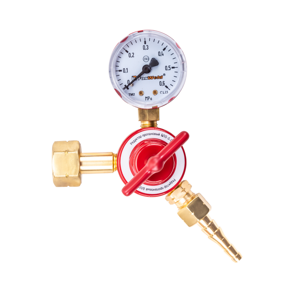 Газовый редуктор БПО-5-СВ производства Foxweld используется для понижения, регулирования и контроля давления газа, выходящего из баллона. Модель предназначена для работы с химическим соединением пропана. Вентиль регулирует подачу газа до рабочего давления, а с помощью манометра осуществляется контроль выходного давления. Газовый редуктор применяется в газосварочных работах, поддерживает заданный расход газа при резке и пайке металлов.ВНЕШНИЕ РЕГУЛИРОВКИ: Газовый редуктор имеет вентиль регулировки давления. Для качественного выполнения газосварочных работ необходимо контролировать давление, поступающее из баллона. Вентиль снижает или понижает поступающее на выходе давление - можно настроить необходимое рабочее давление на выходе и проконтролировать процесс с помощью манометров.ВСТРОЕННЫЙ МАНОМЕТР: Газовый редуктор с манометром позволяет контролировать давление. Манометр показывает пониженное рабочее давление на выходе, делая газосварочный процесс стабильным.БЕЗОПАСНОСТЬ РАБОЧЕГО ПРОЦЕССА: Газовый редуктор выполнен из сплава латуни. Данный вид сплава предотвращает появление искр при закреплении редуктора на газовом баллоне. Модель надежно крепится на баллон с помощью накидной гайки, и корпус изделия не пропускает газ во внешнюю среду. Процесс работы с газовым оборудованием становится проще и безопаснее.СТАБИЛИЗАЦИЯ СВАРОЧНОГО ПРОЦЕССА: Использование газового редуктора в газосварочных работах стабилизирует процесс подачи газа. Полный контроль над уровнем давления на входе позволяет отслеживать уровень заполненности баллона, стабильное давление подачи газа на выходе поддерживает рабочее давление при газосварке.ПРЕИМУЩЕСТВА:Удобство в использованииРегулировка подачи газаКонтроль давления