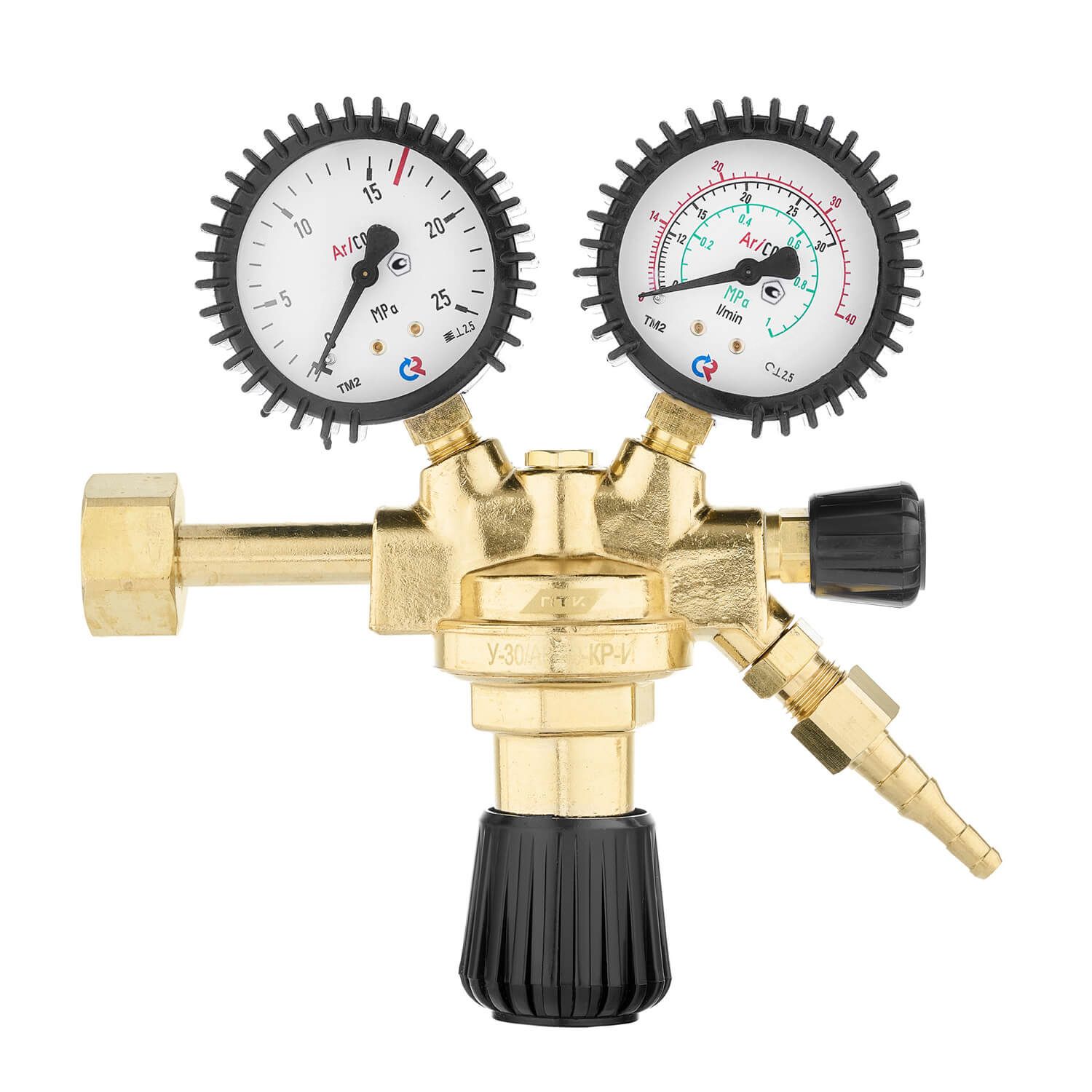 Регулятор расхода газа У-30/АР-40-КР-И с манометрами для углекислоты и аргона предназначен для понижения давления газа и автоматического поддержания постоянным заданного расхода при питании постов и установок в среде защитных газов.