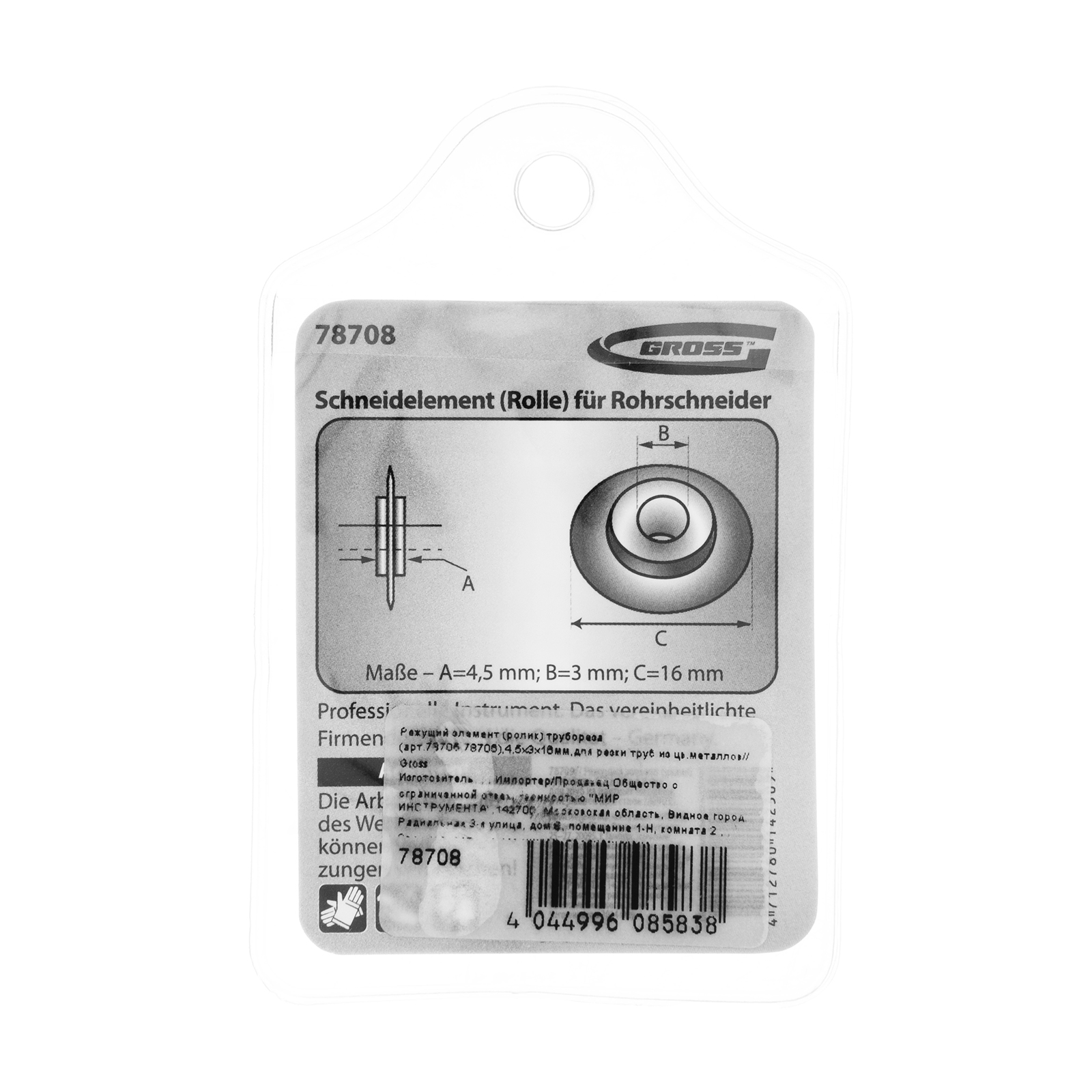 Режущий элемент, ролик трубореза для артиколов 78705, 78706, 4.5 х 3 х 16 мм, для резки труб из цветных металлов Gross в Екатеринбурге