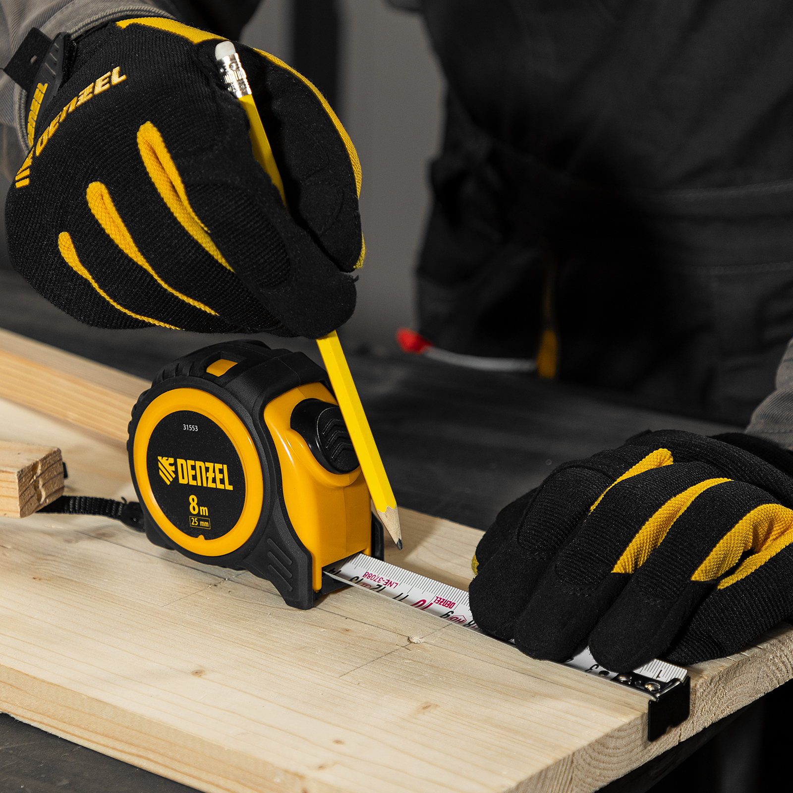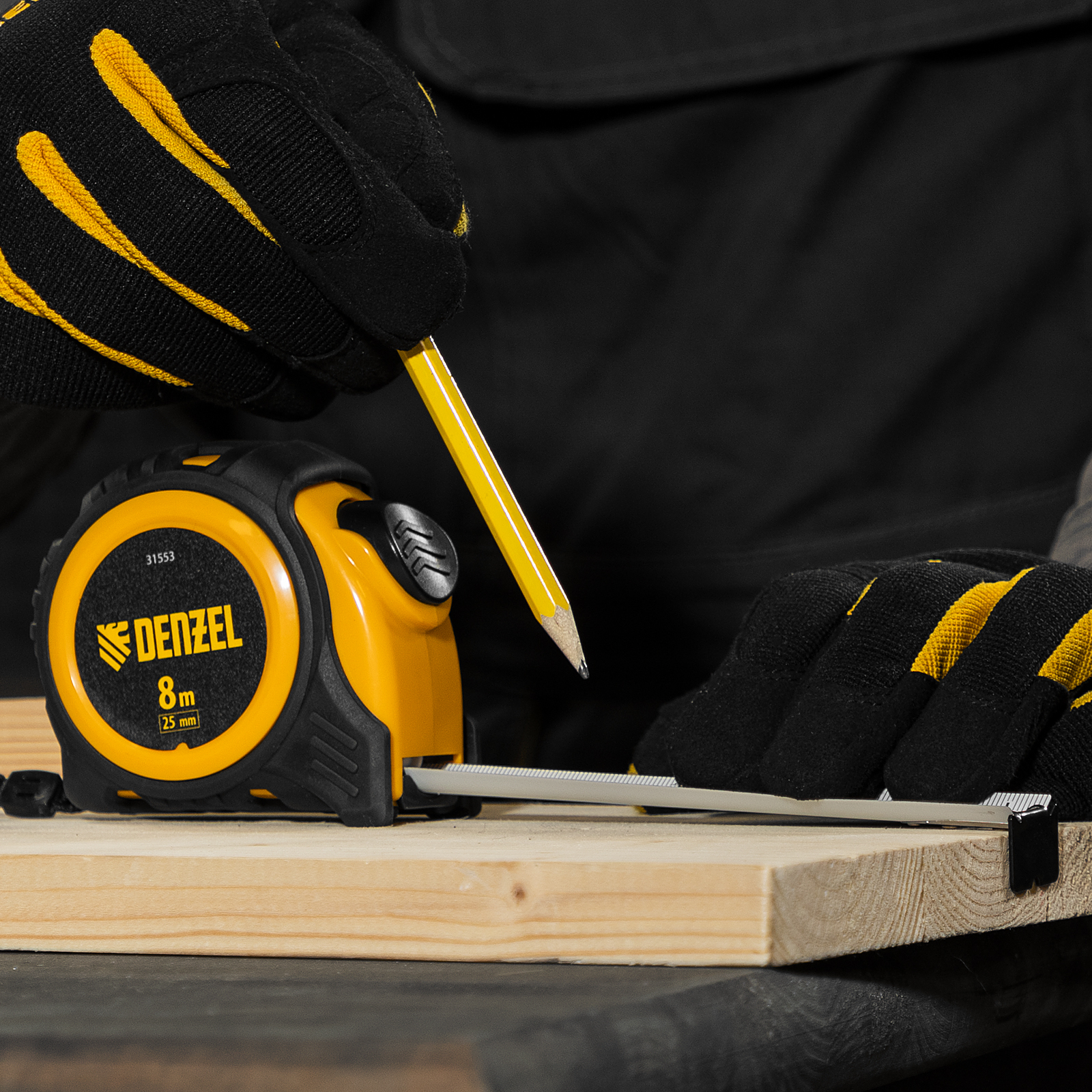 Рулетка Denzel 31553 в обрезиненном корпусе, с автоматической фиксацией, с полотном шириной 25 мм и длиной 8 м, используется для измерения расстояний и размеров предметов. Стальная лента с эмалевым покрытием и защитной пластиной в месте крепления зацепа рассчитана на долгий срок службы. Рулетка будет полезна во время строительства и ремонта, а также пригодится в быту.