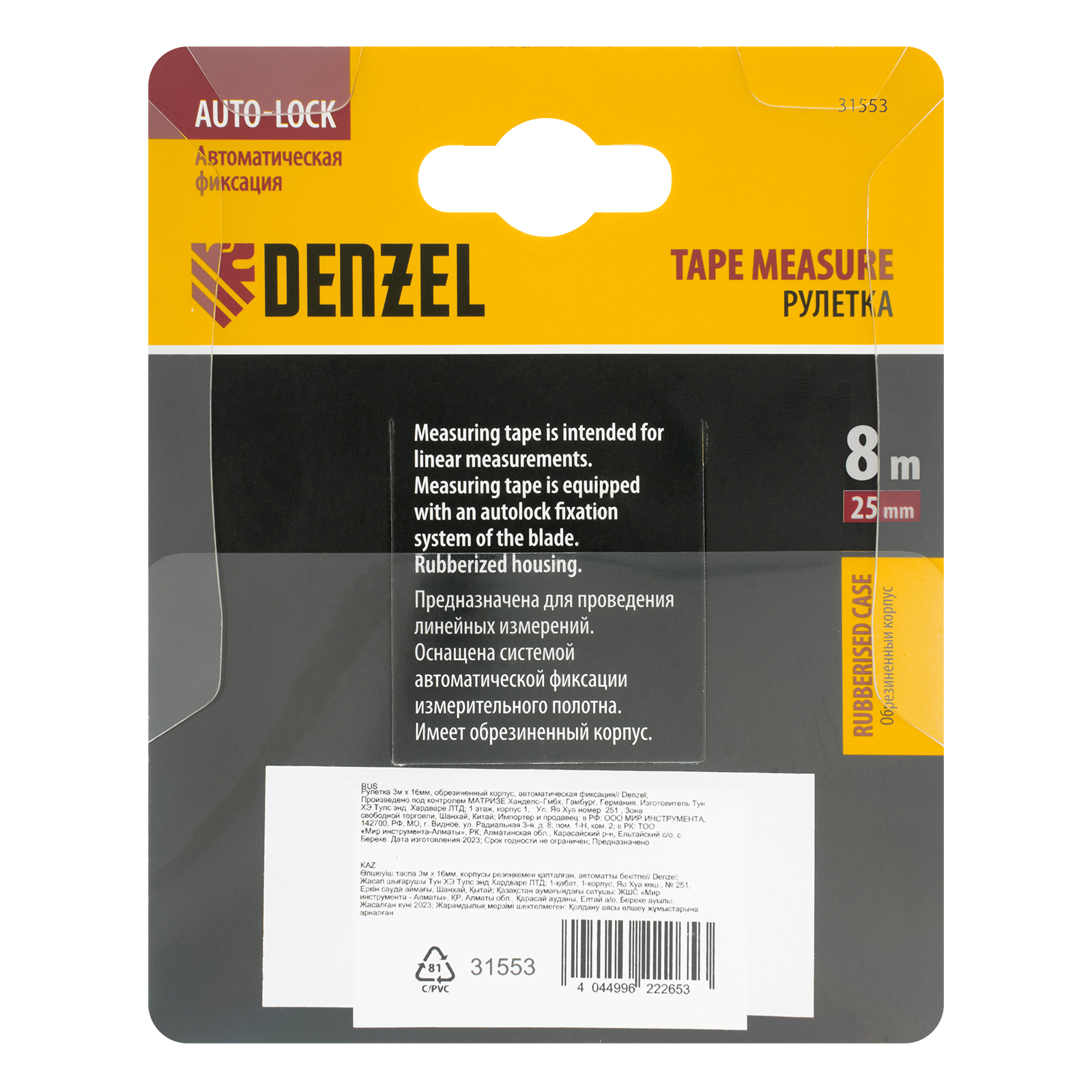 Рулетка 8м х 25мм, обрезиненный корпус, автоматическая фиксация Denzel в Екатеринбурге