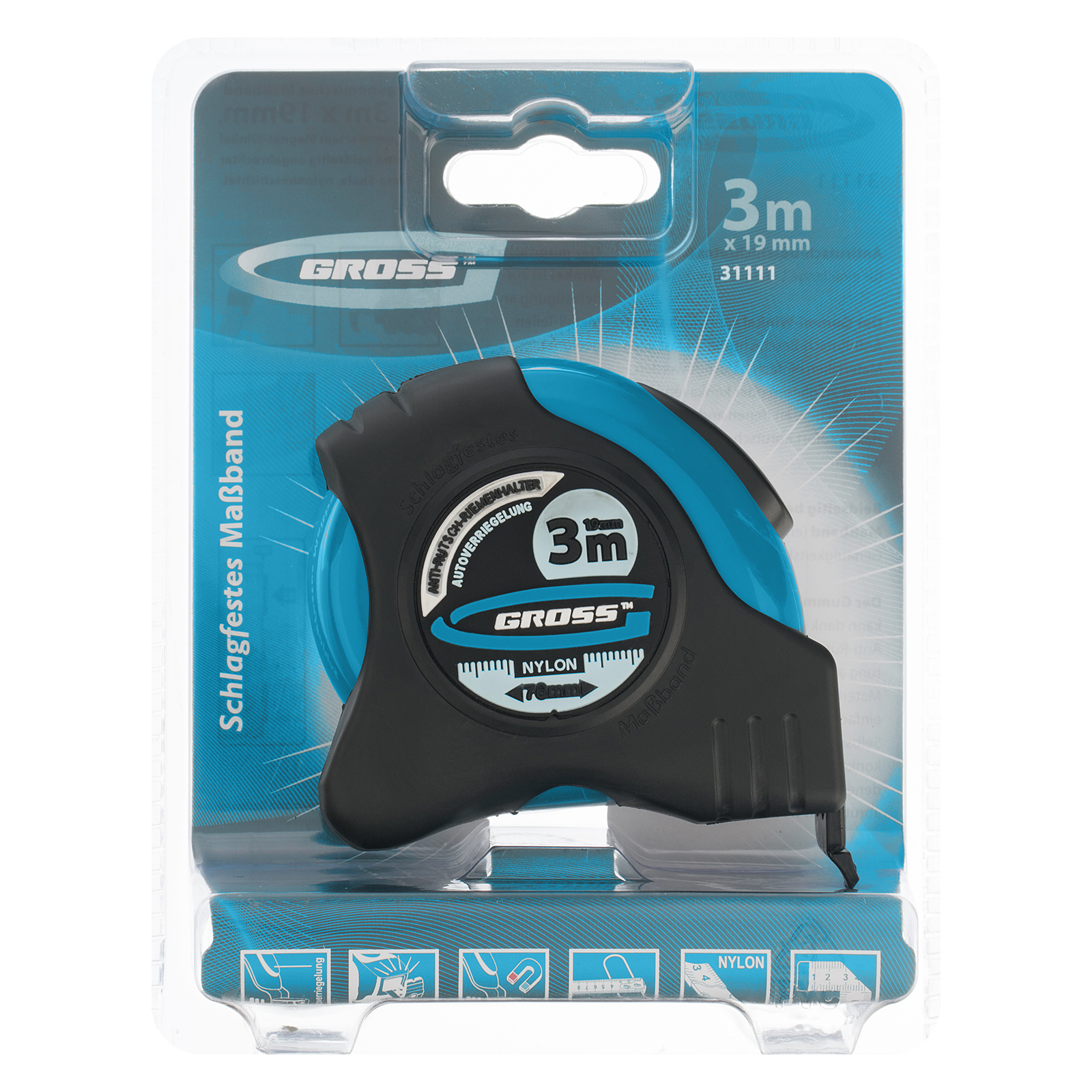 Рулетка Gross «Schlagfest» 31111 с магнитным обрезиненным зацепом, двухсторонней шкалой и функцией автоматической фиксации полотна длиной 3 м и шириной 19 мм, с нейлоновым покрытием, позволяет определять размеры предметов, вычислять площадь помещения и проводить другие измерительные работы. Магнитный обрезиненный зацеп надежно фиксируется на скользких и металлических поверхностях со сложной формой. Карманная рулетка пригодится на строительной площадке и в быту.
