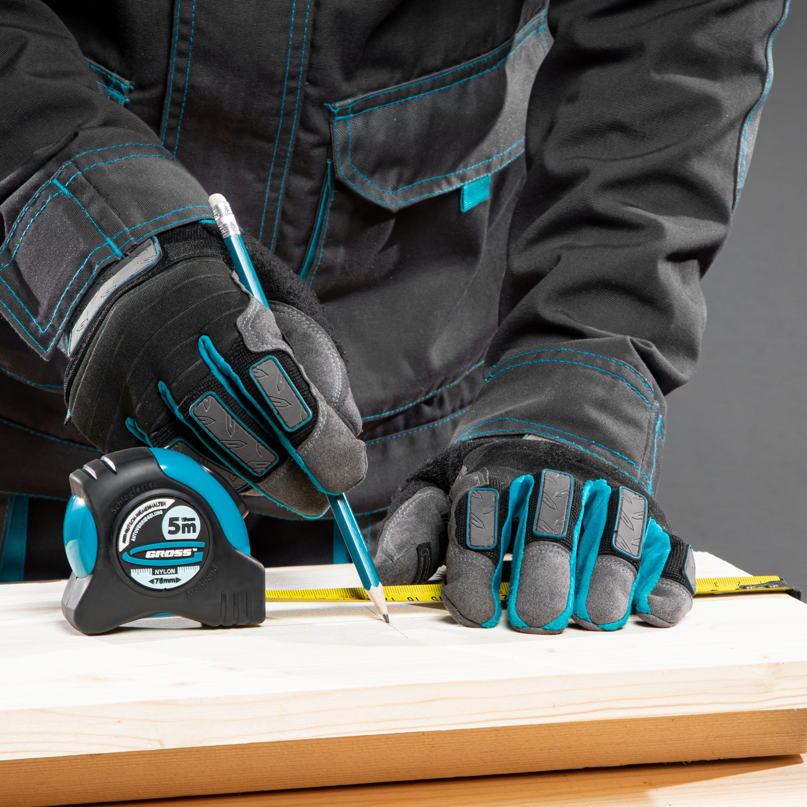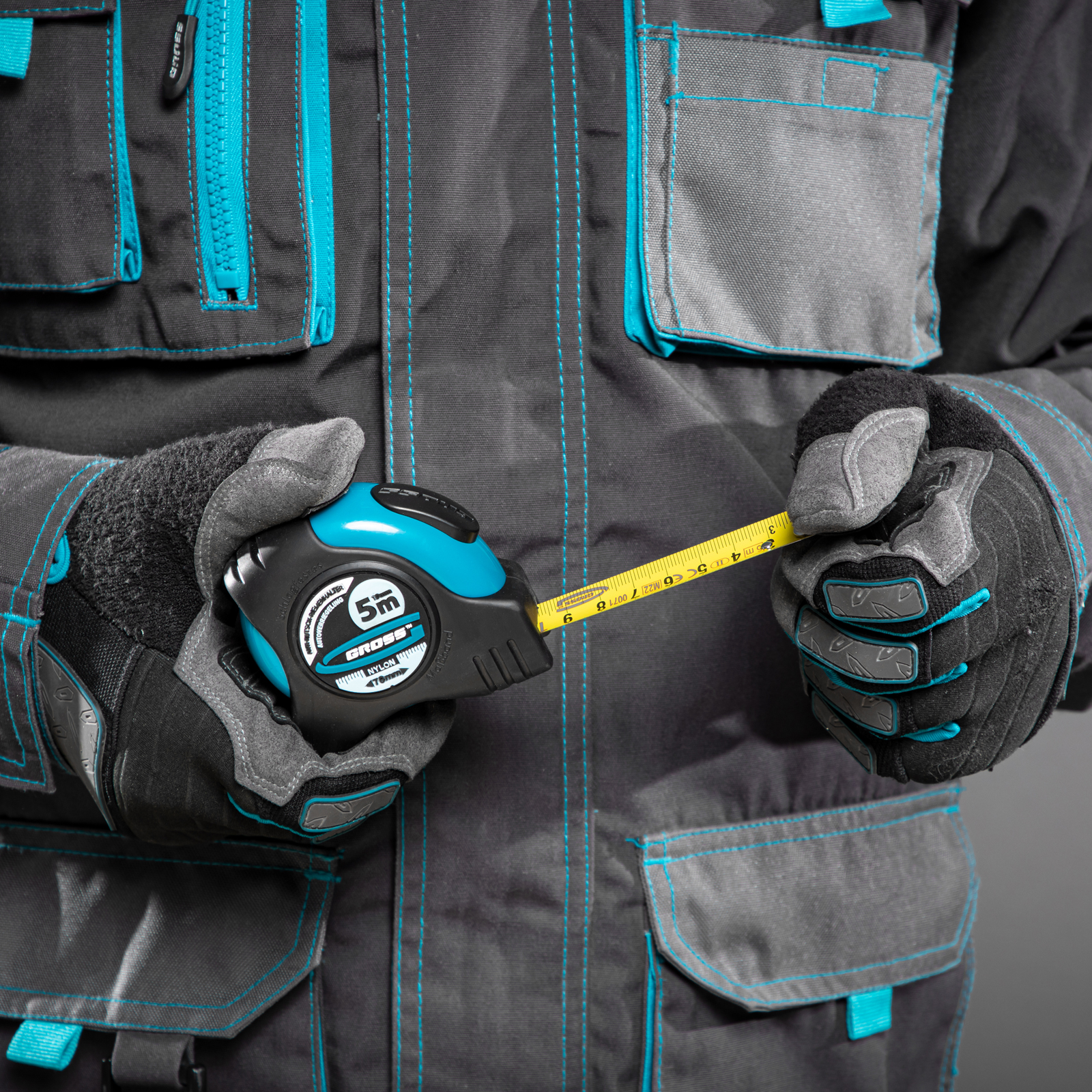 Рулетка Gross «Schlagfest» 31112 с магнитным обрезиненным зацепом, двухсторонней шкалой и функцией автоматической фиксации полотна длиной 5 м и шириной 19 мм, с нейлоновым покрытием, позволяет определять размеры предметов, вычислять площадь помещения и проводить другие измерительные работы. Магнитный обрезиненный зацеп надежно фиксируется на скользких и металлических поверхностях со сложной формой. Карманная рулетка пригодится на строительной площадке и в быту.