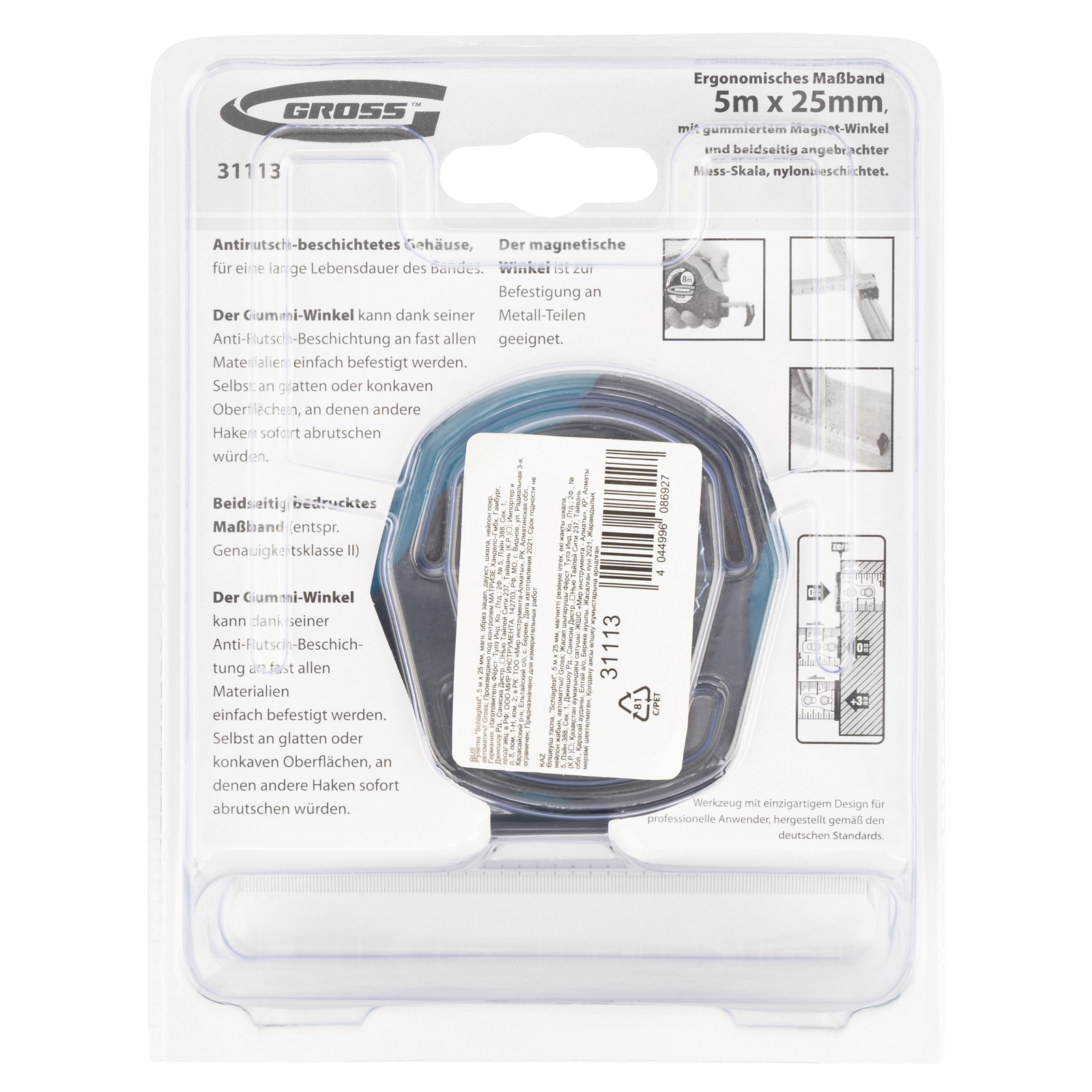 Рулетка Gross «Schlagfest» 31113 с магнитным обрезиненным зацепом, двухсторонней шкалой и функцией автоматической фиксации полотна длиной 5 м и шириной 25 мм, с нейлоновым покрытием, позволяет определять размеры предметов, вычислять площадь помещения и проводить другие измерительные работы. Магнитный обрезиненный зацеп надежно фиксируется на скользких и металлических поверхностях со сложной формой. Широкое упругое полотно облегчает работу в труднодоступных местах. Карманная рулетка пригодится на строительной площадке и в быту.