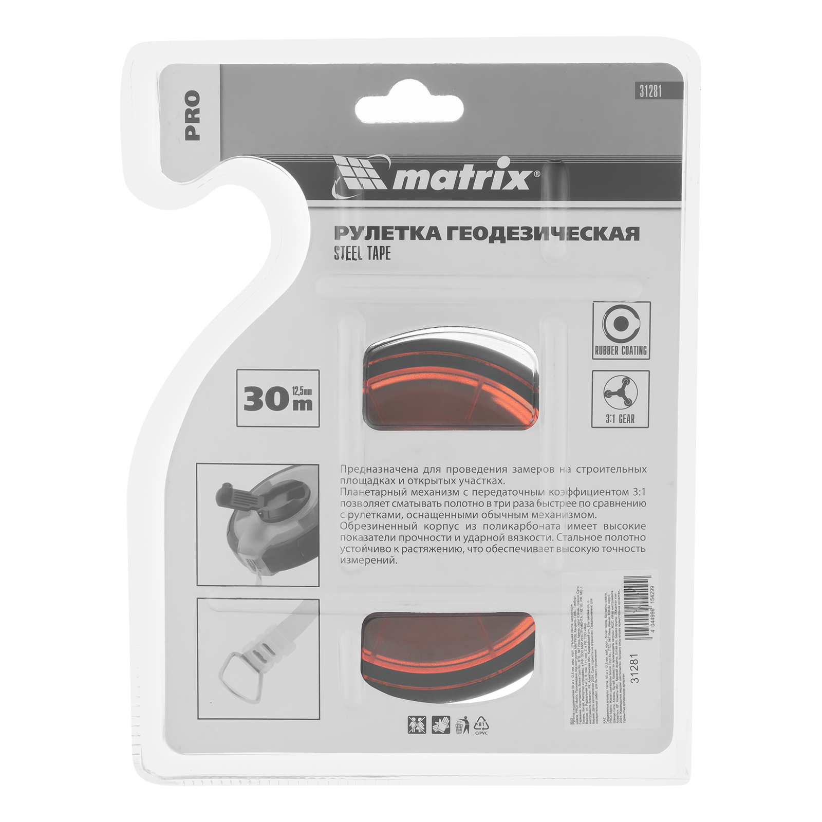 Геодезическая рулетка Matrix PRO 31281 в закрытом корпусе, со стальной лентой длиной 30 м и шириной 12,5 мм, с односторонней шкалой, применяется для проведения замеров на открытых участках. Рулетка оснащена кольцом-зацепом для надежной фиксации измерительной ленты на объекте. Пригодится во время строительных работ, обмеров садовых участков и дорог, обустройства территории.
