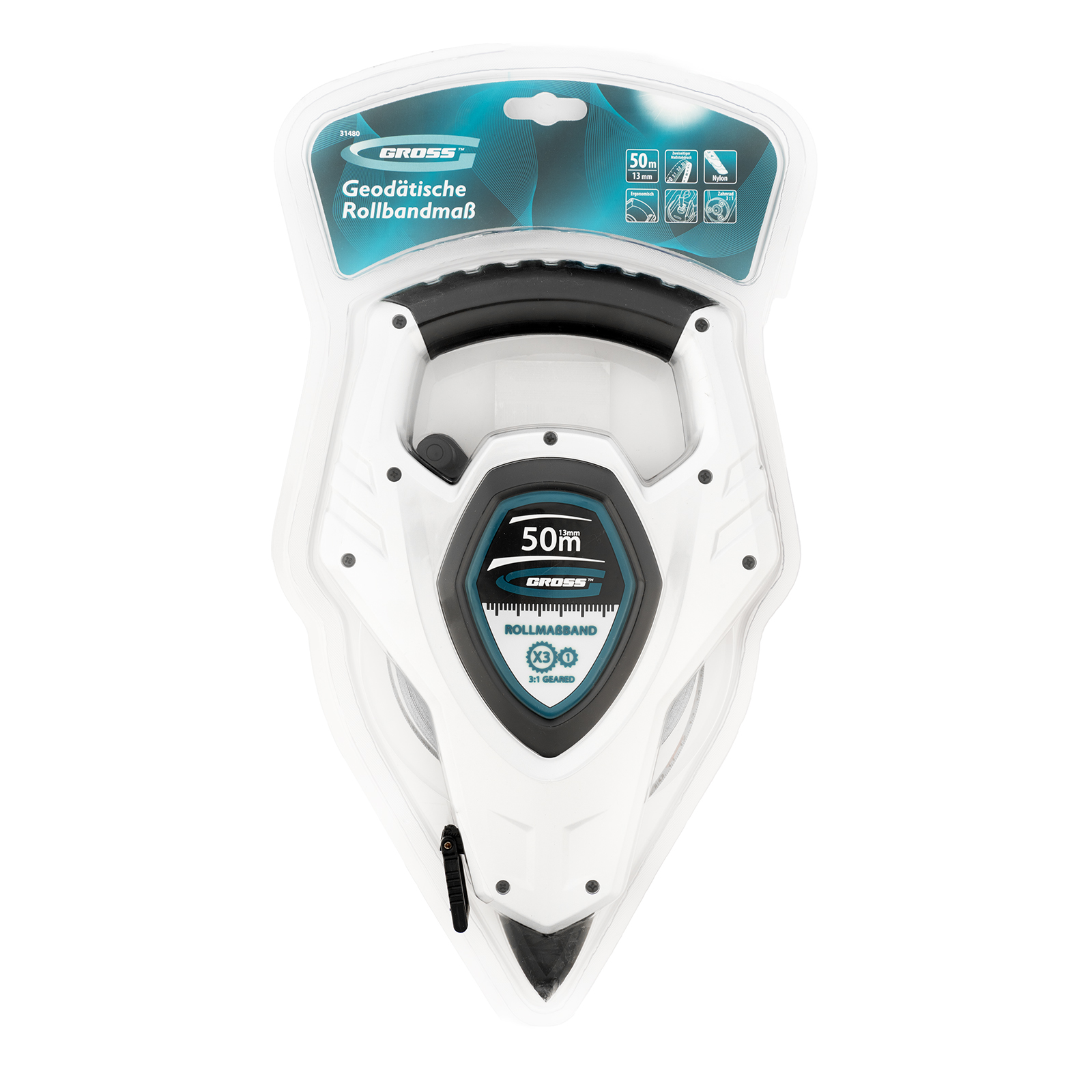 Геодезическая рулетка Gross 31480 в открытом корпусе, с металлической лентой длиной 50 м и шириной 13 мм, с покрытием Super-Нейлон и двусторонней шкалой, предназначена для проведения измерительных работ на строительных площадках и земельных участках большой площади. Стальная лента повышенной жесткости облегчает выполнение длинномерных измерений. Инструмент можно зафиксировать в почве — в нижней части корпуса имеется заостренный наконечник.