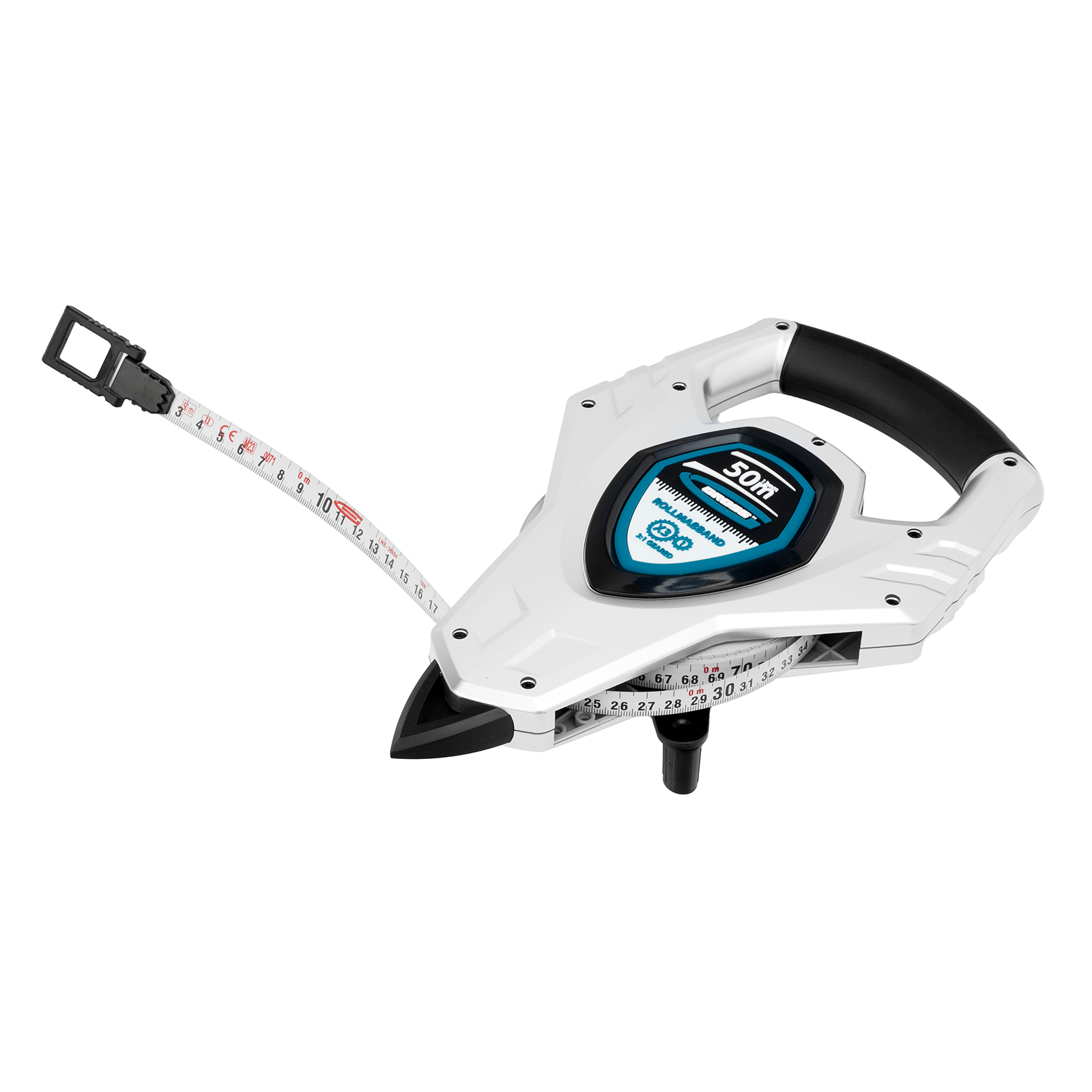 - Быстрая смотка ленты — благодаря коэффициенту оборотов возвратного механизма 1:3 полотно сматывается втрое быстрее, чем на рулетках с обычным механизмом.