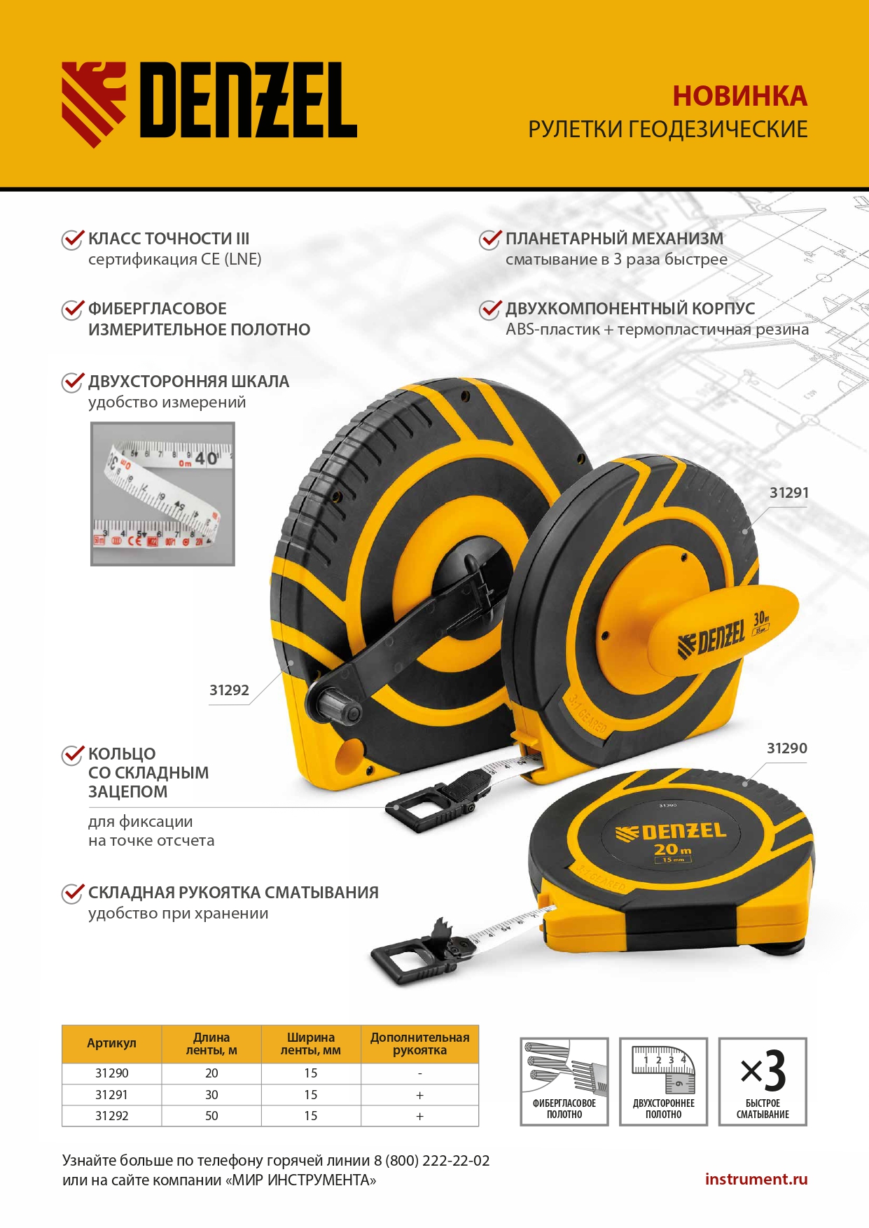 - Долговечность — фибергласовое измерительное полотно характеризуется прочностью и коррозионной стойкостью.