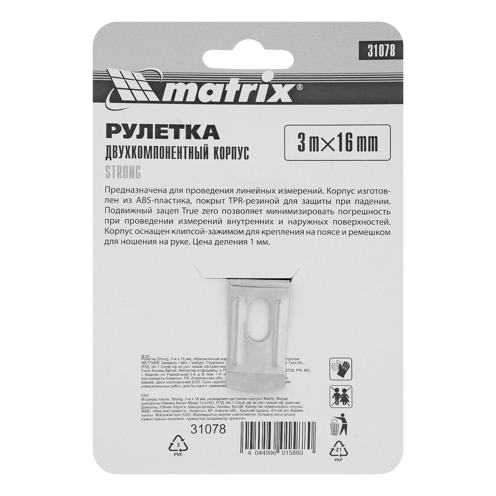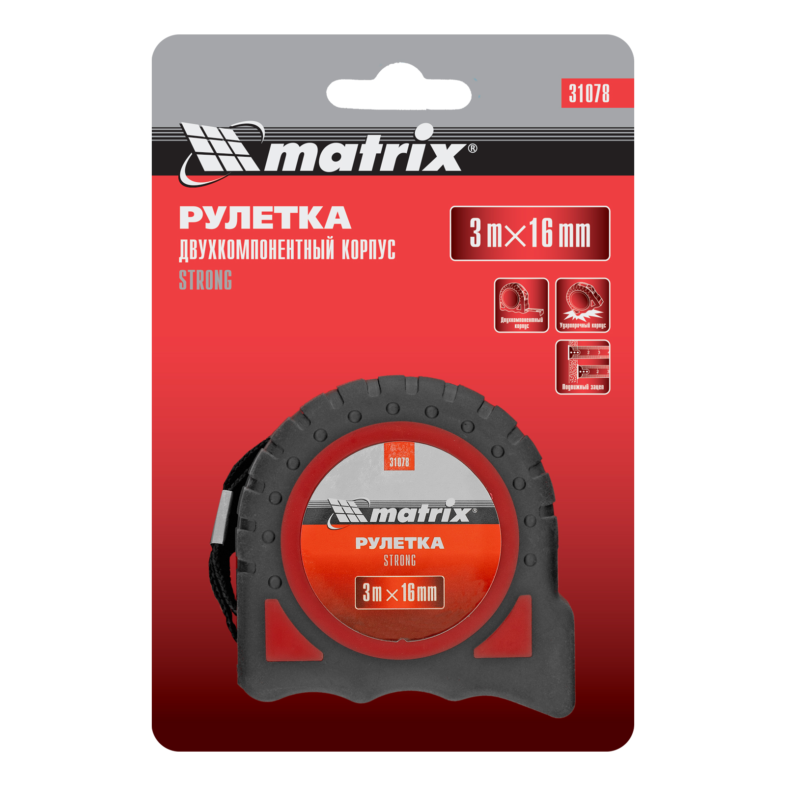 Рулетка Strong,3 м х 16 мм,обрезиненный корпус Matrix в Екатеринбурге