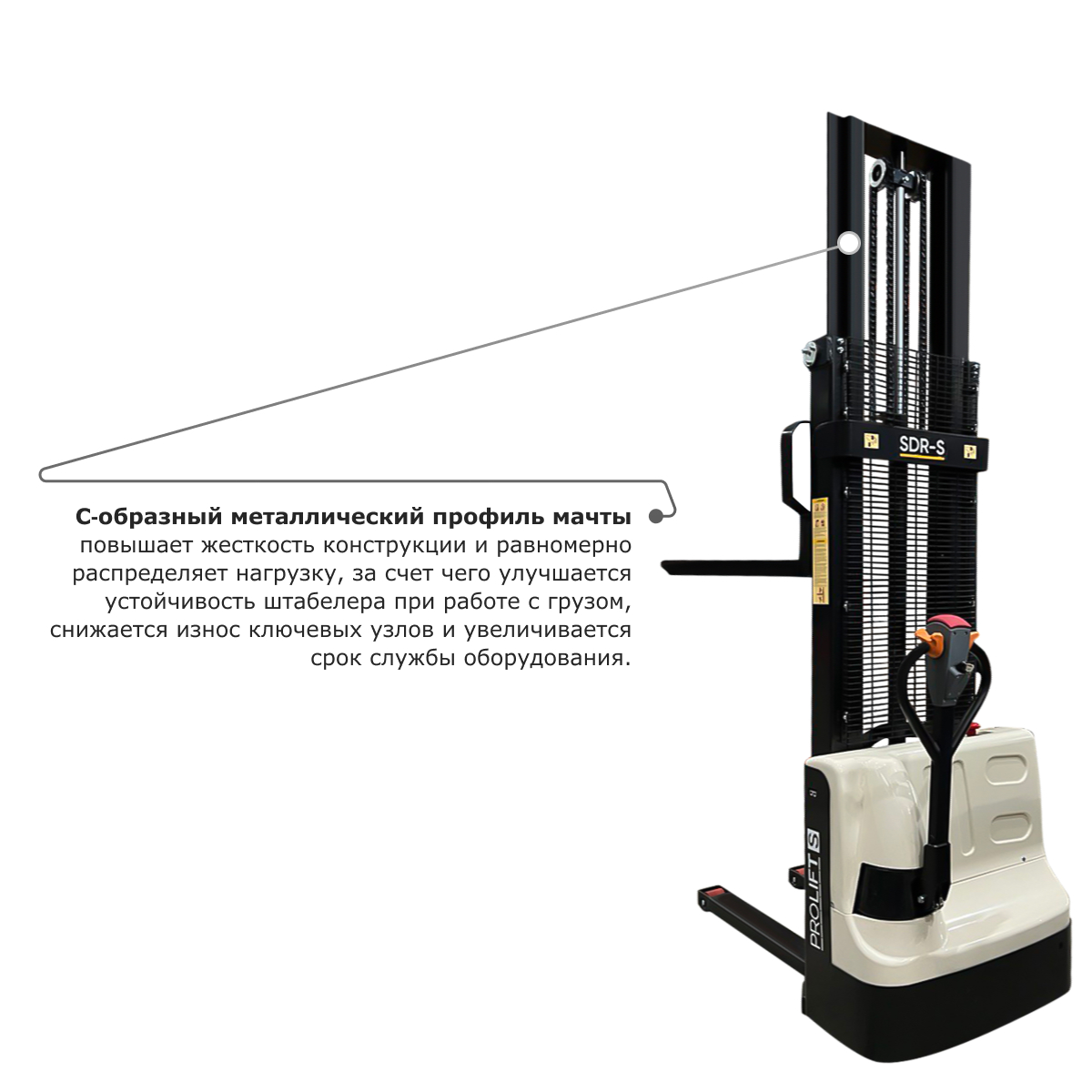 Мачта выполнена из С-образного профиля с дополнительными ребрами жесткости, благодаря чему срок эксплуатации штабелера значительно возрастает.