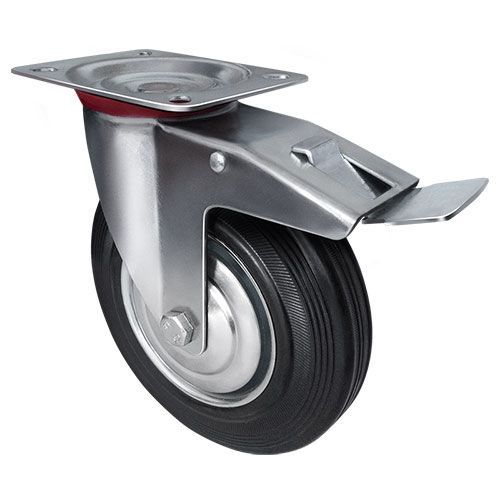 Колесо промышленное поворотное с тормозом SCB55 предназначено для мусорных контейнеров, промышленного оборудования, платформенных тележек, лесов и строительных вышек-тур. Шинка выполнена из литой, черной резины. Колесо имеет стальной оцинкованный обод. В оси установлен роликовый подшипник. Кронштейн с платформенным креплением изготовлен из оцинкованной стали. Отличается средней устойчивостью к воздействию химических веществ. Может передвигаться по грубой поверхности и эксплуатироваться в условиях влажной среды.