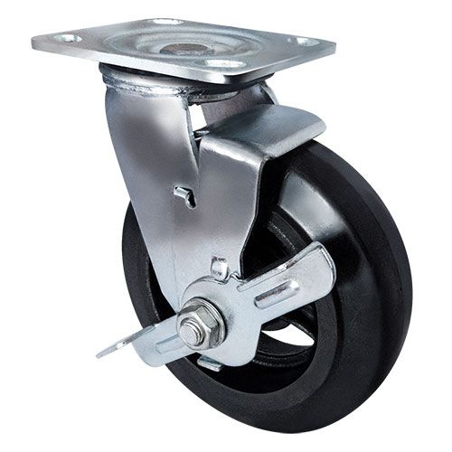 Колесо большегрузное обрезиненное поворотное с тормозом SCDB80 предназначено для строительного, коммунального и складского оборудования. Шинка выполнена из термопластичной черной резины. Материал отличается высокой износостойкостью и сопротивляемостью к неблагоприятным воздействиям внешней среды. Колесо не требовательно к качеству напольного и дорожного покрытия. Обод выполнен из чугуна и оснащен смазочным ниппелем. В оси установлен роликовый подшипник. В поворотном механизме установлен двухрядный шариковый подшипник с пресс-масленкой. Кронштейн — сварной, изготовлен из оцинкованной листовой стали. Диапазон температур — от -35ºC до +50ºC.
