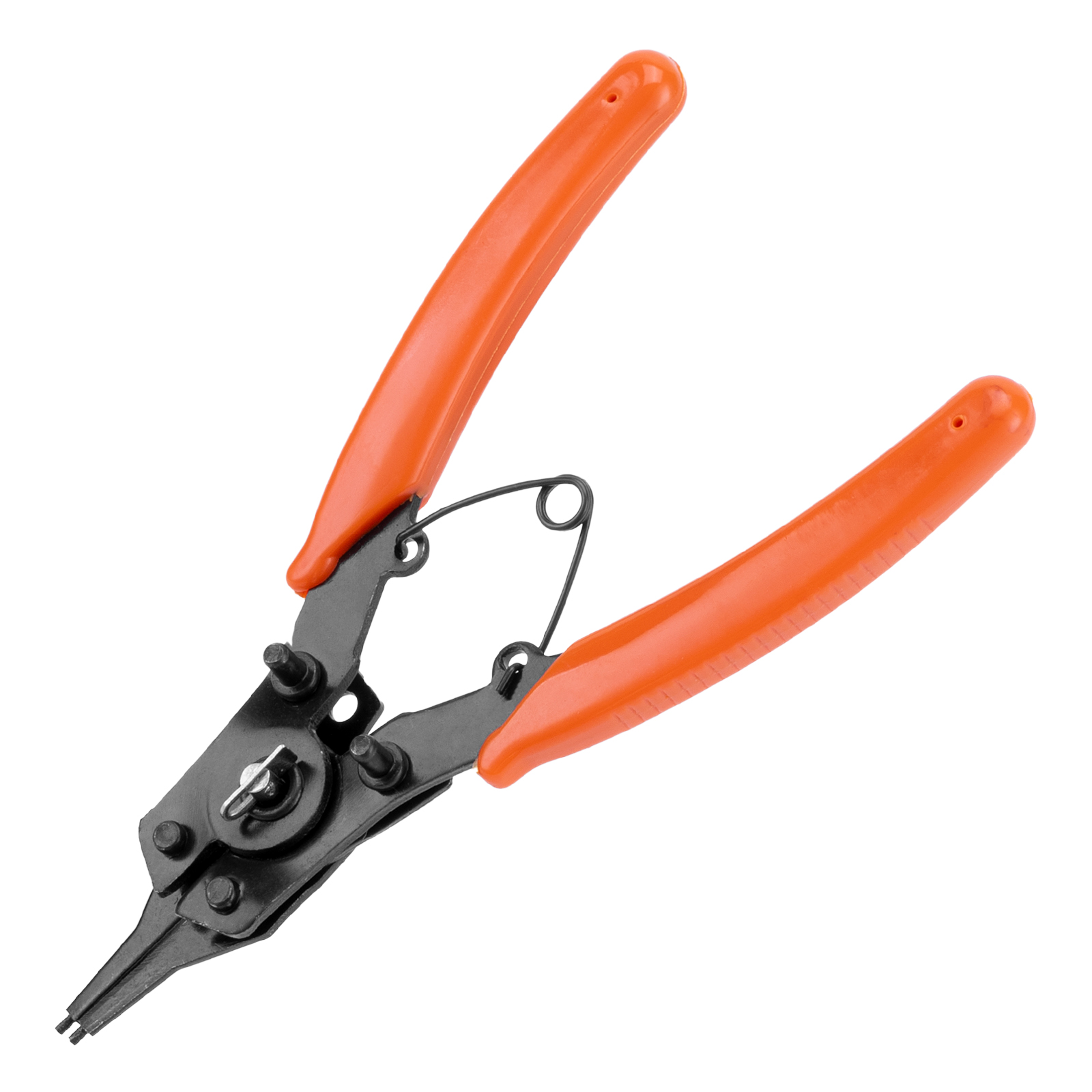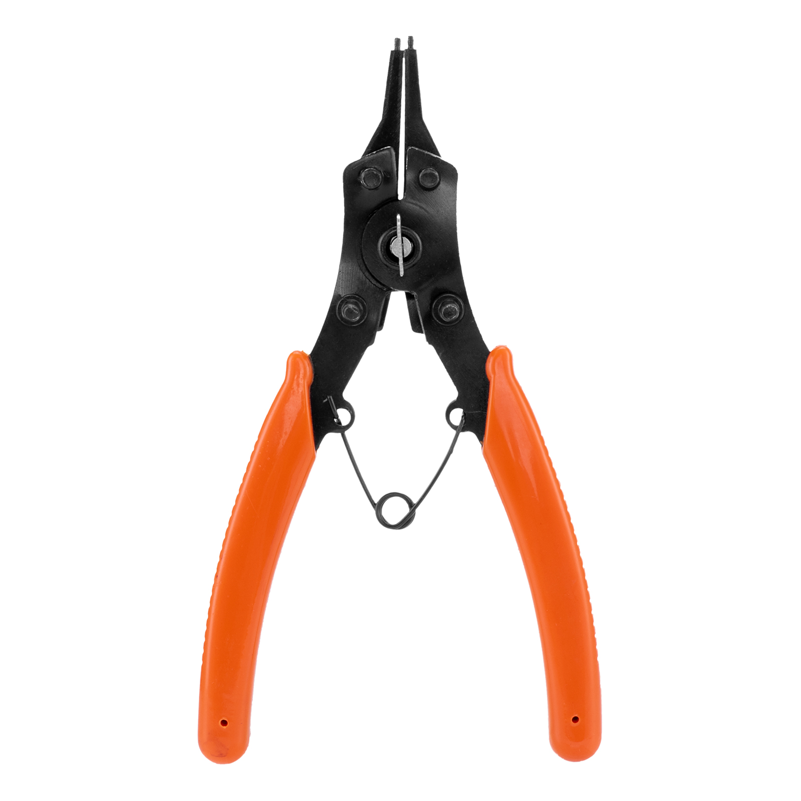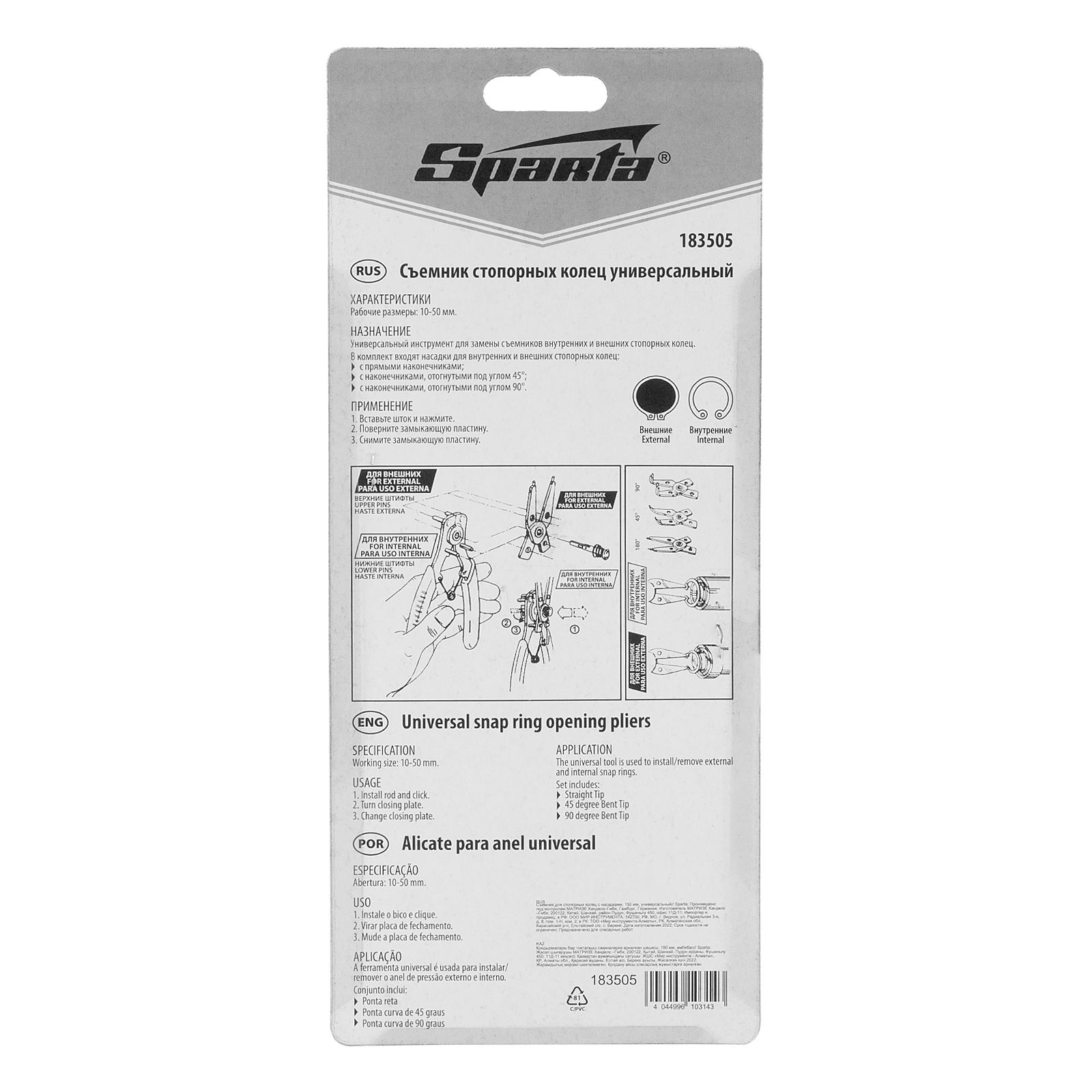 Универсальный съемник Sparta 183505 длиной 150 мм, с насадками, избавляет от необходимости приобретать отдельные инструменты для внешних и внутренних стопорных колец. В зависимости от способа установки насадки съемник способен работать как на сжим, так и на разжим. Используется для колец с отверстиями. Будет полезен в ремонтной мастерской, дома или в гараже.
