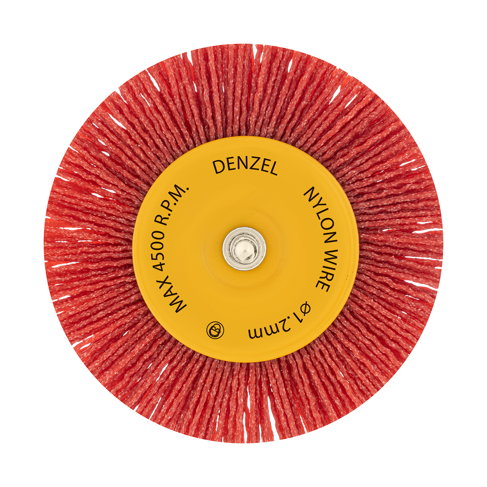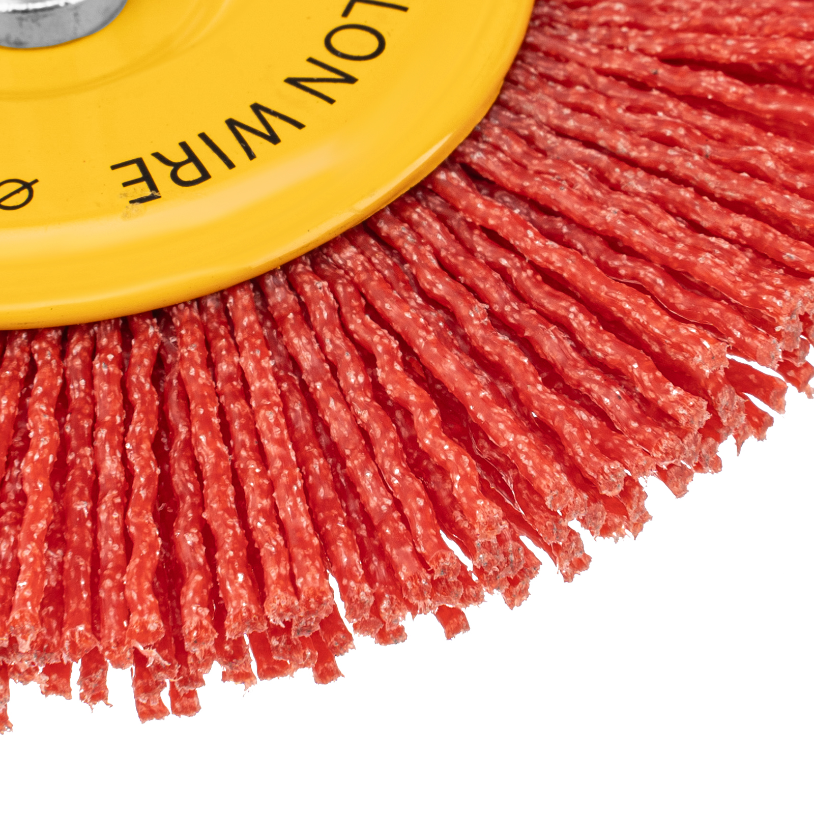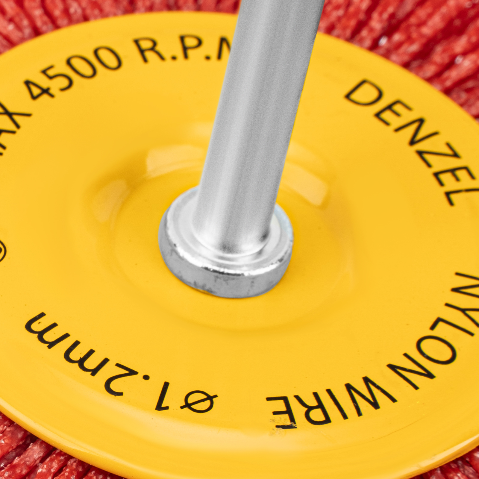 Плоская щетка Denzel 74434 диаметром 100 мм, со шпилькой и нейлоновой щетиной, — насадка для дрели, предназначенная для выполнения шлифовальных работ по пластику, древесине, стали и цветным металлам. Щетина изготовлена из высококачественного нейлона с нанесенным абразивом из оксида алюминия. Щетка оптимальна для деликатного удаления загрязнений, краски, пятен ржавчины с твердых поверхностей. Позволяет придать шероховатость поверхности, подходит для браширования древесины. Благодаря плоской форме насадка удобна для обработки пазов, изгибов и угловых соединений.