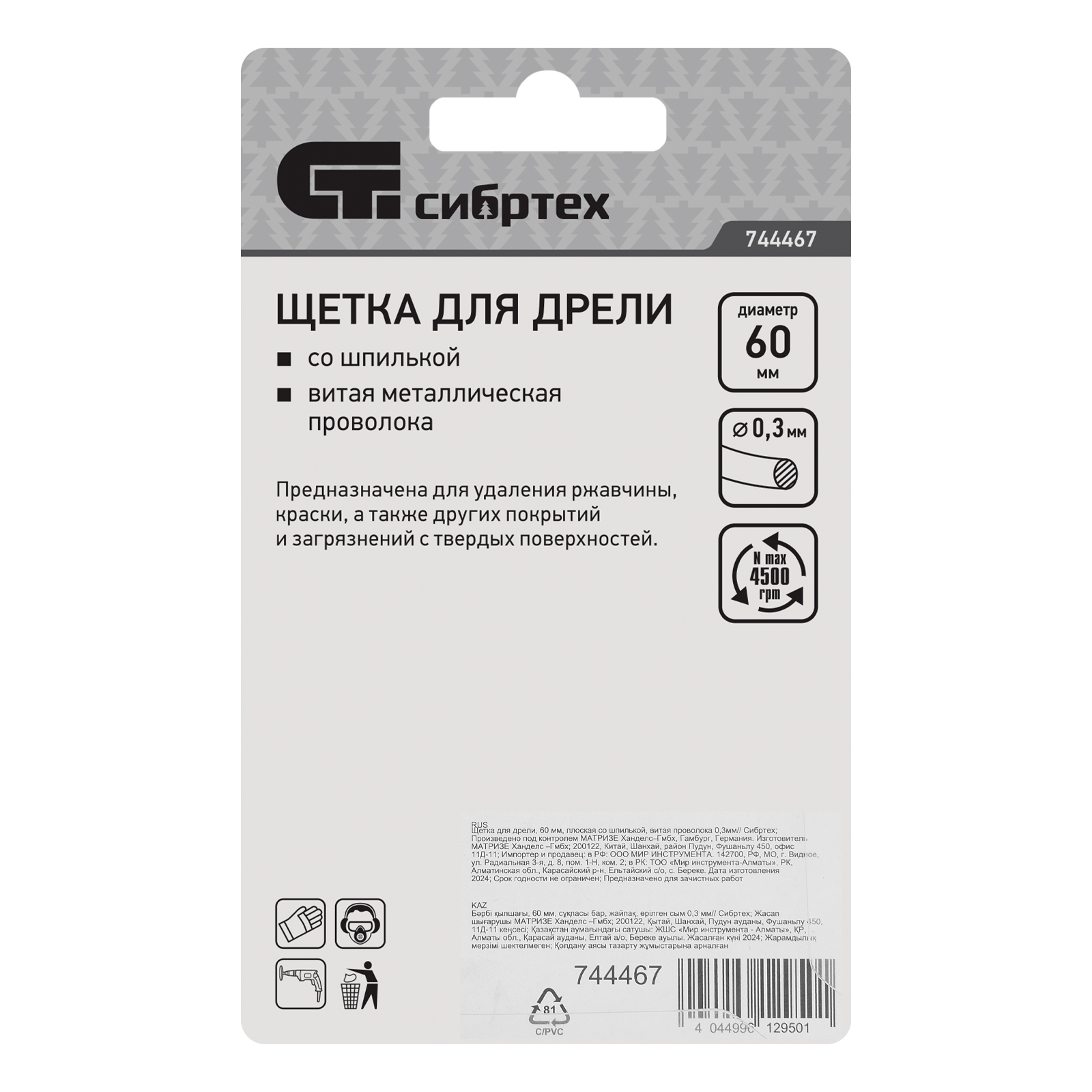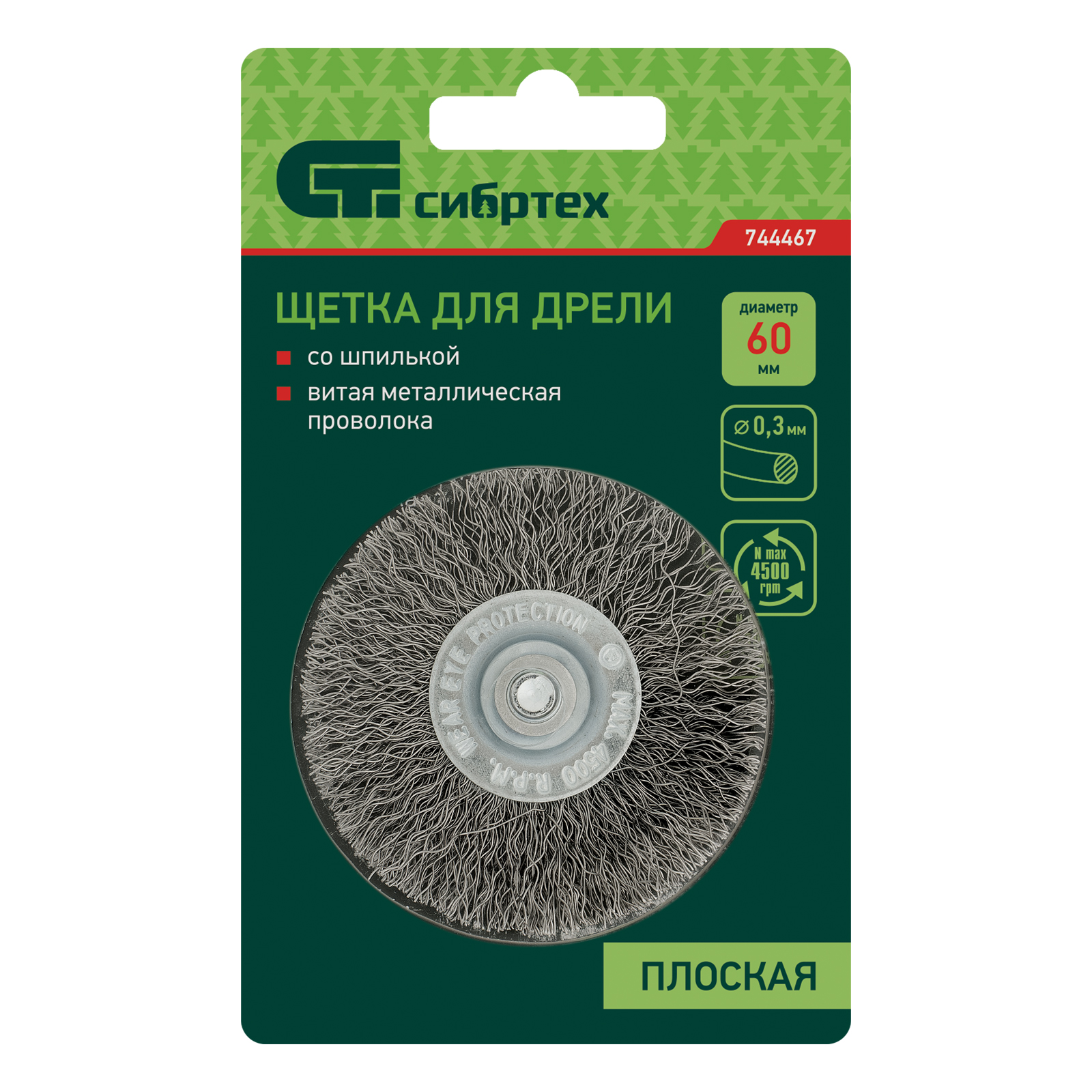 Плоская щетка для дрели Сибртех 744467 диаметром 60 мм, со шпилькой и щетиной из витой проволоки 0,3 мм, используется для щадящей обработки металлических, деревянных и пластиковых поверхностей. Удаляет загрязнения, ржавчину, старые лакокрасочные покрытия. Благодаря плоской форме щетка идеально подходит для очистки труднодоступных мест, пазов, изгибов, внутренних углов. Хвостовик диаметром 6 мм устанавливается в патрон дрели. Рекомендуемая скорость вращения 4500 об/мин. Во время работы следует использовать средства индивидуальной защиты. Щетку применяют во время строительства, ремонта, а также в быту.