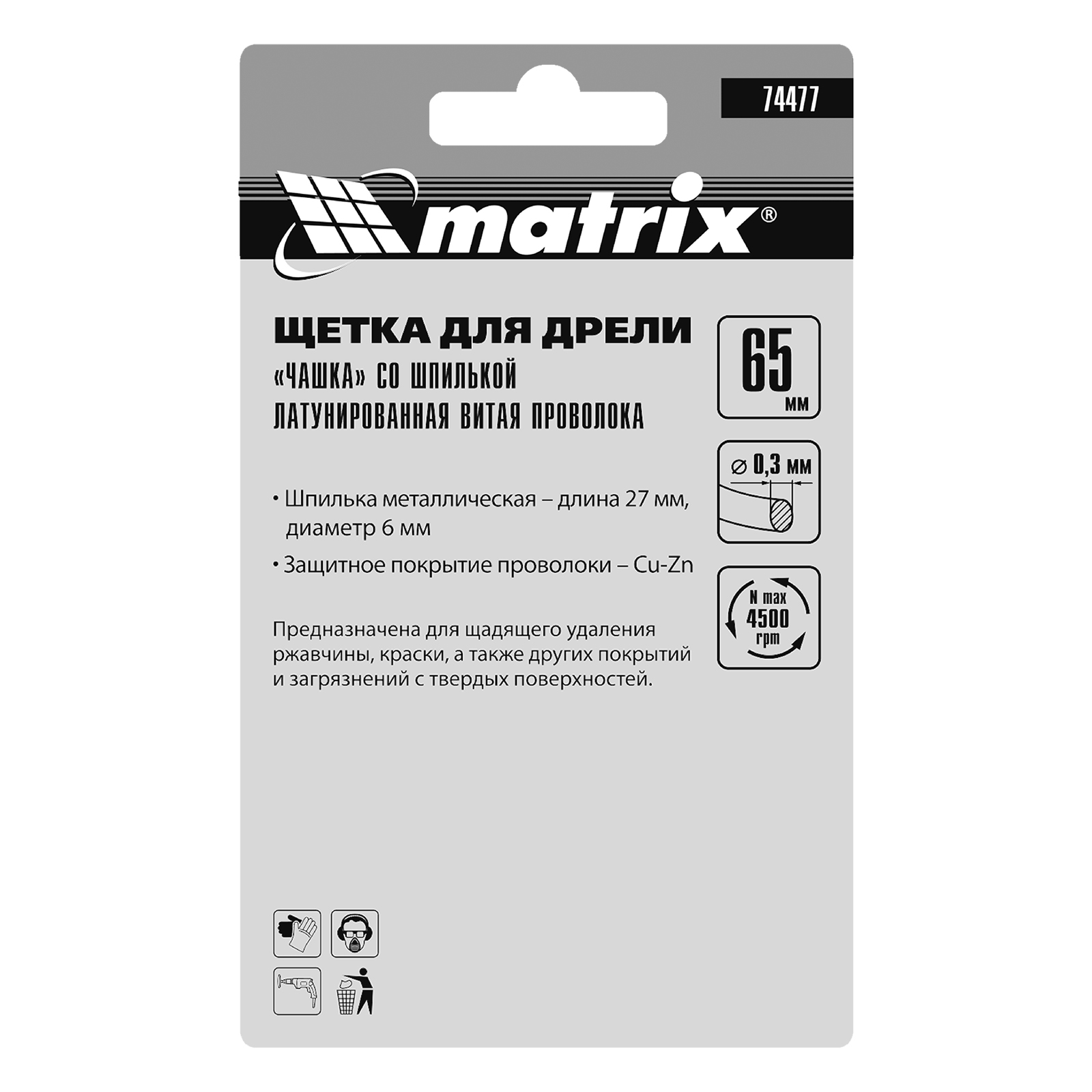 Щетка для дрели «чашка» Matrix 74477 диаметром 65 мм, со шпилькой и щетиной из латунированной витой проволоки, используется для очистки металлических, деревянных и пластиковых поверхностей от незначительных загрязнений и остатков лакокрасочных покрытий. Помогает подчеркнуть структуру материала или придать ему шероховатость. Хвостовик диаметром 6 мм устанавливается в патрон электродрели, поддерживающей скорость 4500 об/мин. Во время работы нужно использовать средства индивидуальной защиты — респиратор, очки, наушники, спецодежду и обувь. Щетка пригодится как профессиональным, так и домашним мастерам.