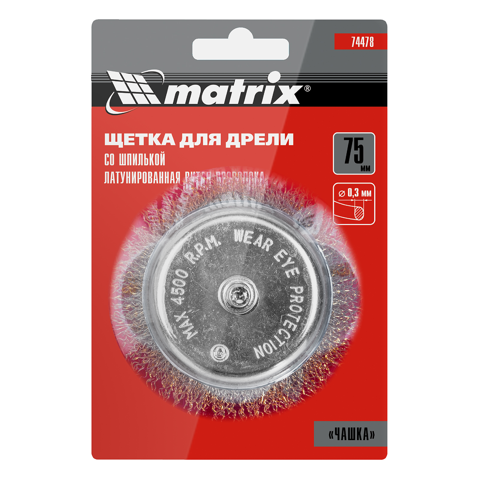 Щетка для дрели, 75 мм, "чашка" со шпилькой, латунированная витая проволока Matrix в Екатеринбурге