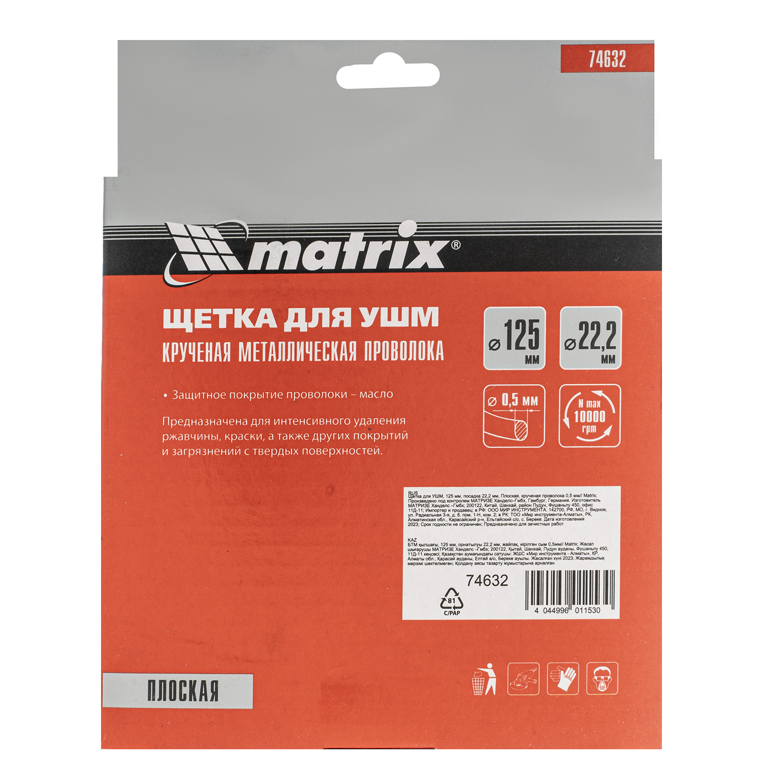 Плоская щетка Matrix 74632 диаметром 125 мм и посадкой 22,2 мм, с щетиной из крученой проволоки толщиной 0,5 мм, устанавливается на вал УШМ, поддерживающей скорость вращения не более 10000 об/мин. Эффективно удаляет загрязнения, толстый слой ржавчины и лакокрасочных материалов с поверхностей, поэтому используется для проведения грубой (черновой) обработки. Плоской щеткой удобно очищать труднодоступные места, в том числе углы и изгибы.