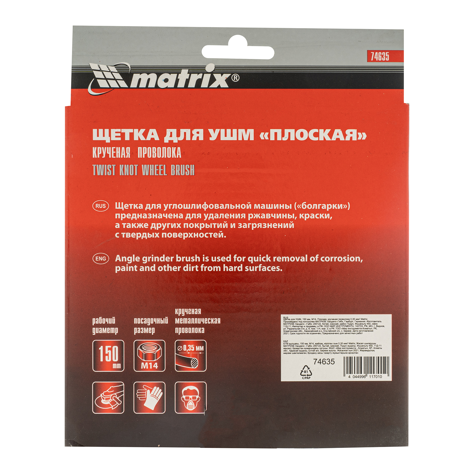 Плоская щетка Matrix 74635 диаметром 150 мм, с щетиной из крученой проволоки толщиной 0,35 мм и гайкой М14, — оснастка для УШМ, предназначенная для грубой (черновой) обработки поверхностей. Максимально допустимая скорость вращения шпинделя — 9000 об/мин. Щетка позволяет снять толстый слой ржавчины, лакокрасочных покрытий, загрязнений, а также зачистить сварные швы. Плоская форма удобна для обработки углов, изгибов и других труднодоступных мест.