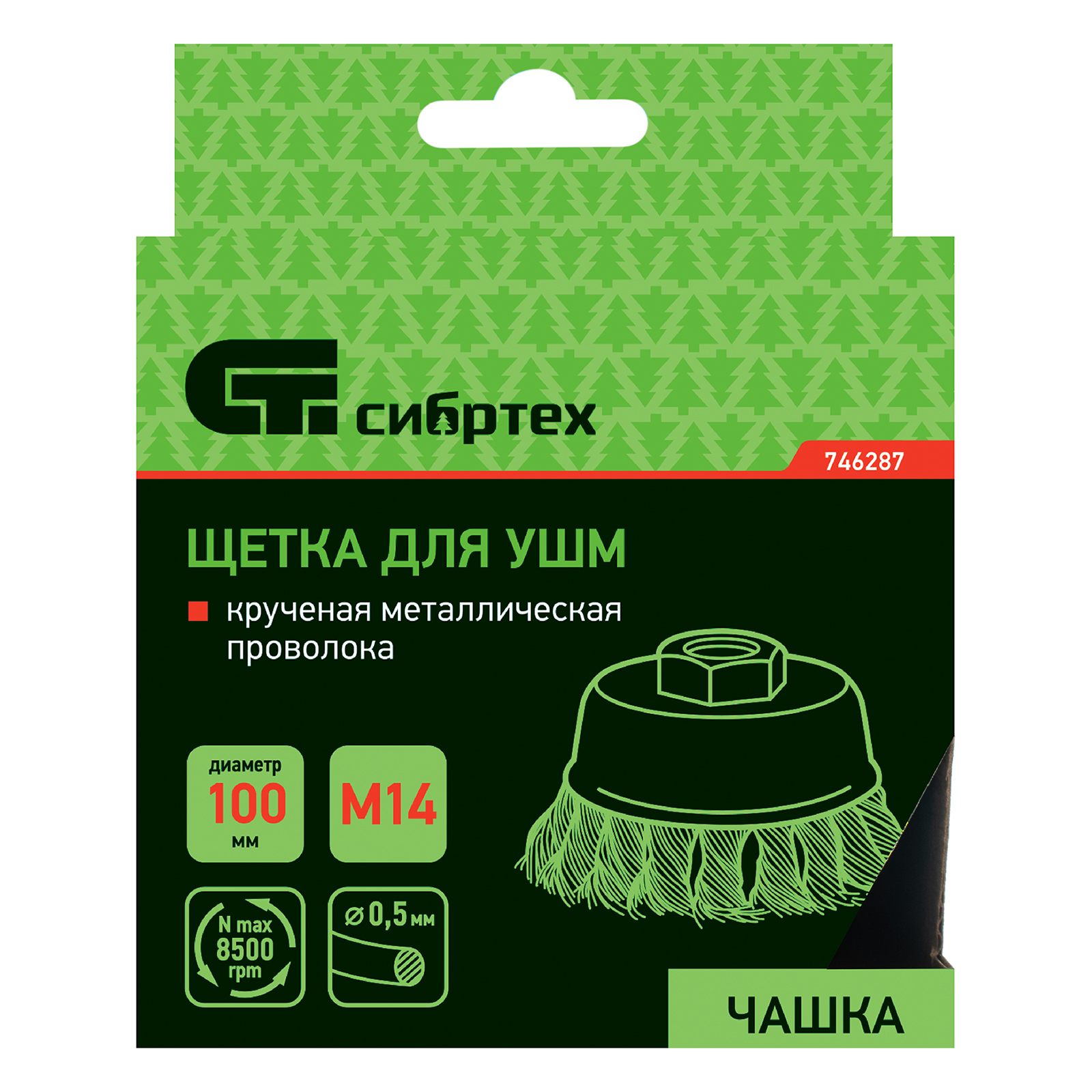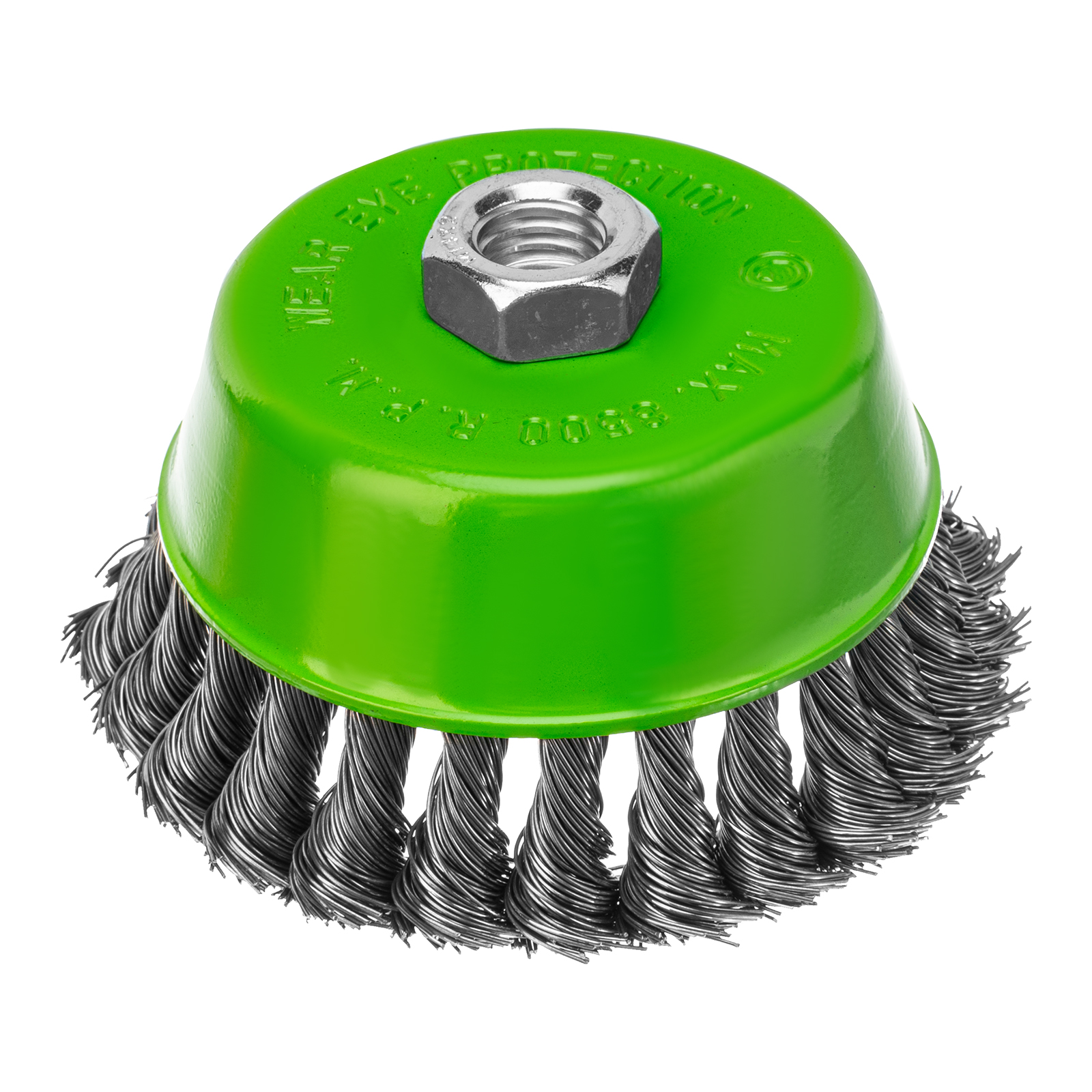 Щетка Сибртех «Чашка» 746287 диаметром 100 мм, с присоединительной резьбой М14, с щетиной из крученой проволоки диаметром 0,5 мм, устанавливается на УШМ, поддерживающую работу со скоростью 8500 об/мин. Изделие предназначено для грубой (черновой) обработки поверхностей и подходит для удаления загрязнений, снятия толстого слоя ржавчины, ЛКМ, зачистки сварных швов.
