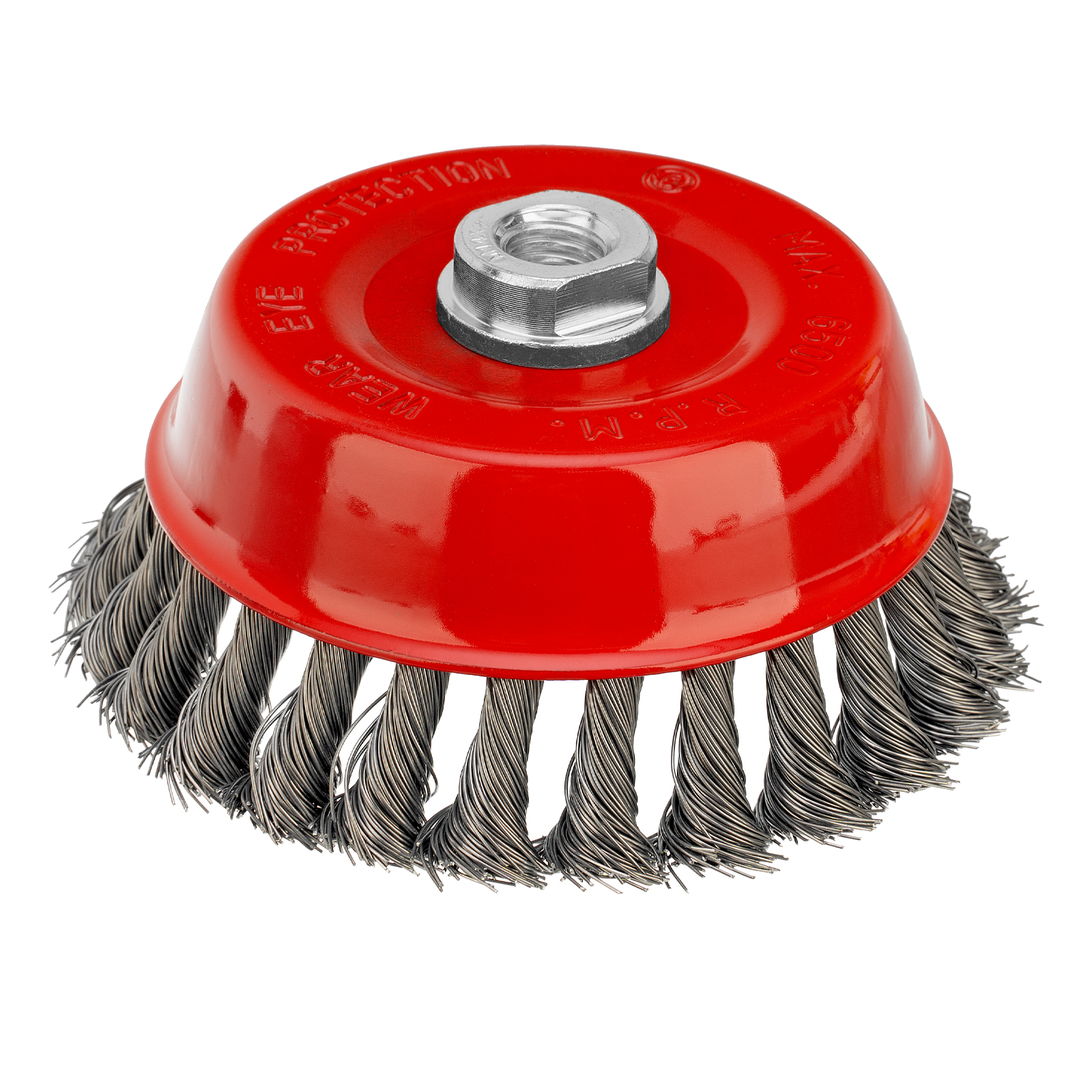 Щетка Matrix «Чашка» 74627 диаметром 125 мм, с присоединительной резьбой М14, с щетиной из крученой проволоки диаметром 0,5 мм, устанавливается на УШМ, поддерживающую работу со скоростью 6500 об/мин. Изделие предназначено для грубой (черновой) обработки поверхностей и подходит для удаления загрязнений, снятия толстого слоя ржавчины, ЛКМ, зачистки сварных швов.