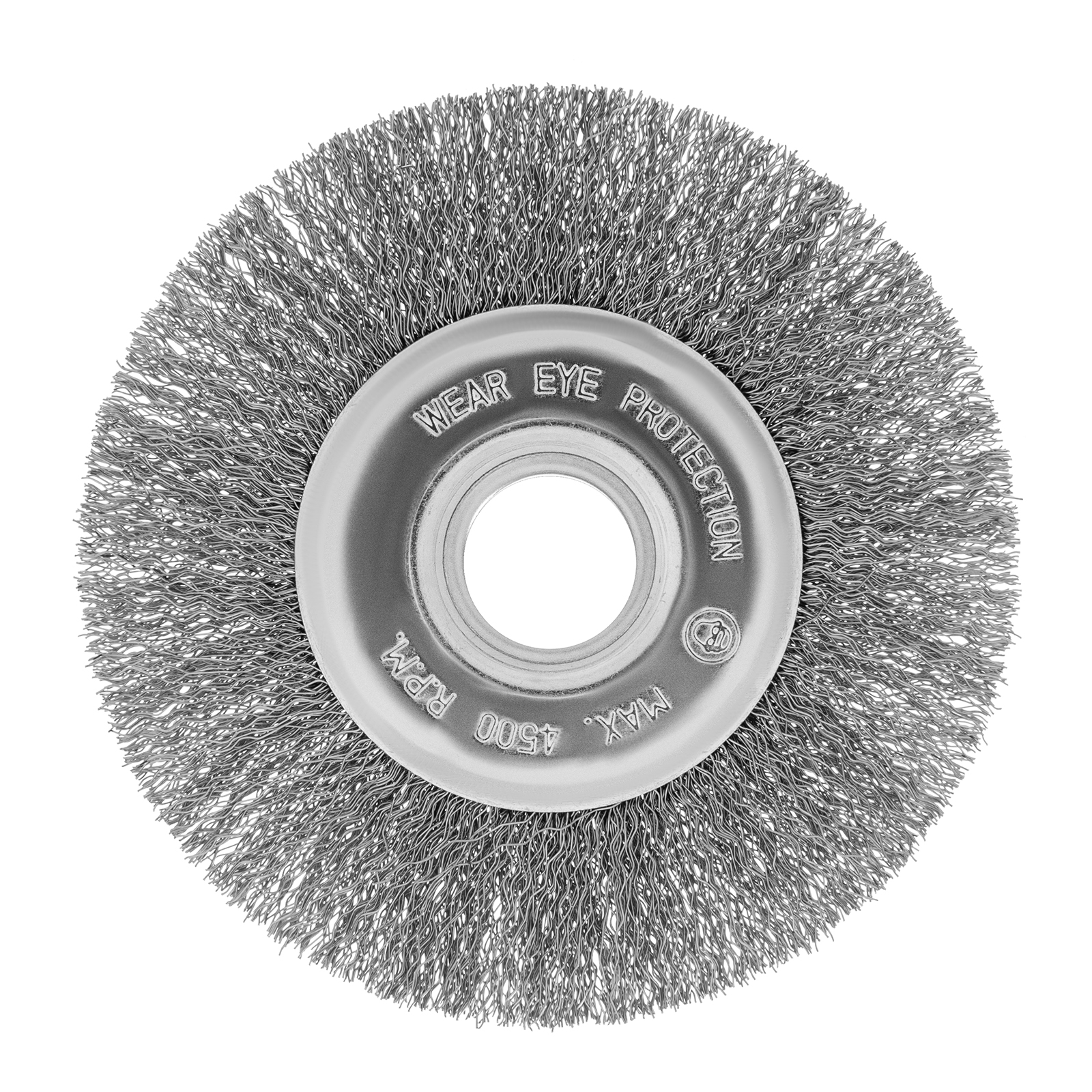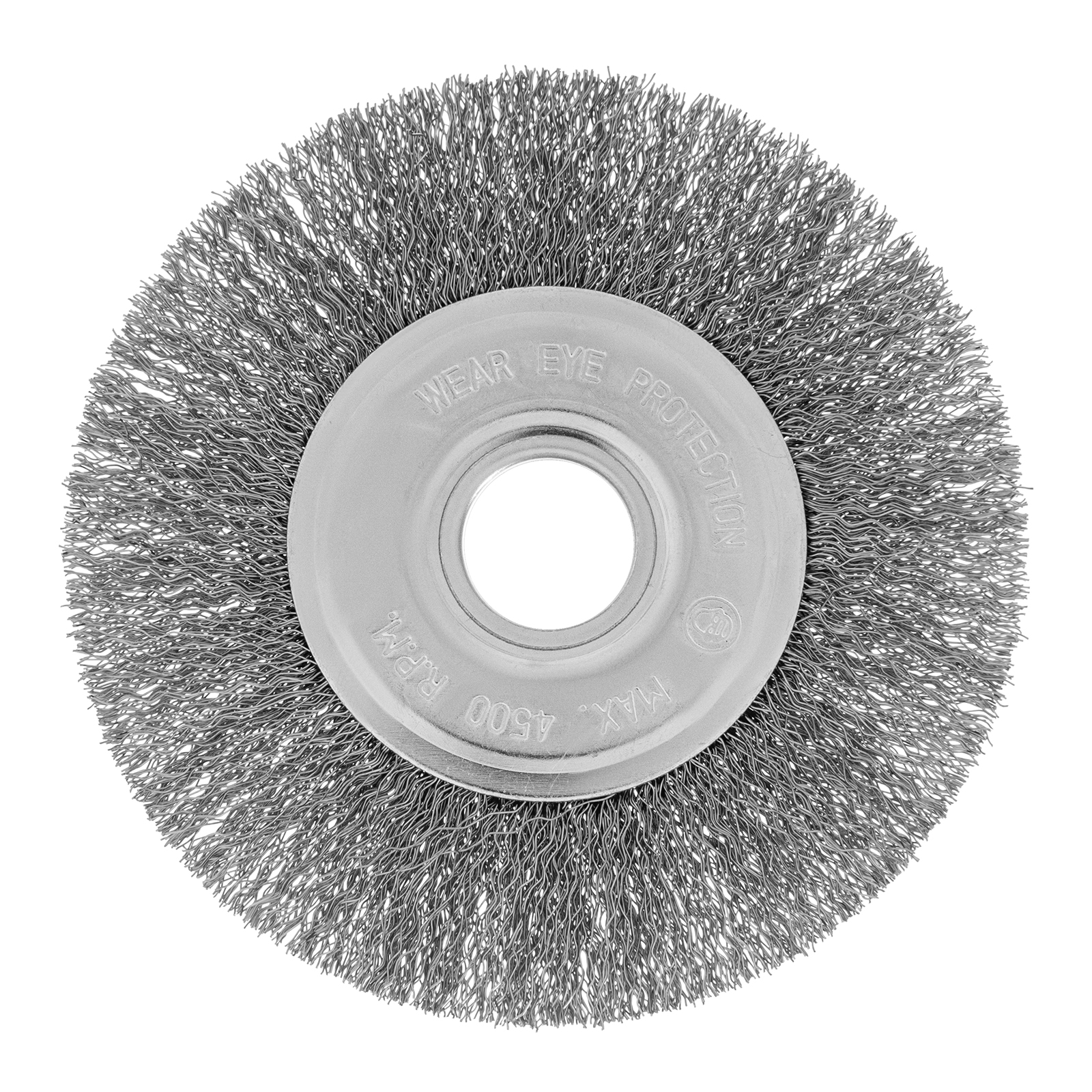 Плоская щетка для УШМ Сибртех 746567 диаметром 125 мм, с посадкой 22,2 мм, с щетиной из витой проволоки диаметром 0,3 мм, предназначена для щадящей очистки твердых поверхностей от загрязнений, ржавчины, остатков краски и других покрытий. Щетина из тонкой проволоки постепенно снимает тонкий слой материала, позволяя придать шероховатость или подчеркнуть структуру материала.,Насадка устанавливается на фланец углошлифовальной машины и подходит для продолжительной работы, не требующей частой смены оснасток. Рекомендуемая максимальная скорость вращения составляет 4500 об/мин. Для обеспечения безопасности пользователя следует использовать средства индивидуальной защиты. Щетка применяется в строительной, производственной сфере, а также в быту.