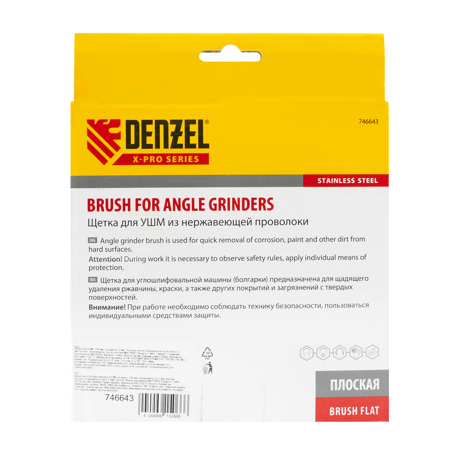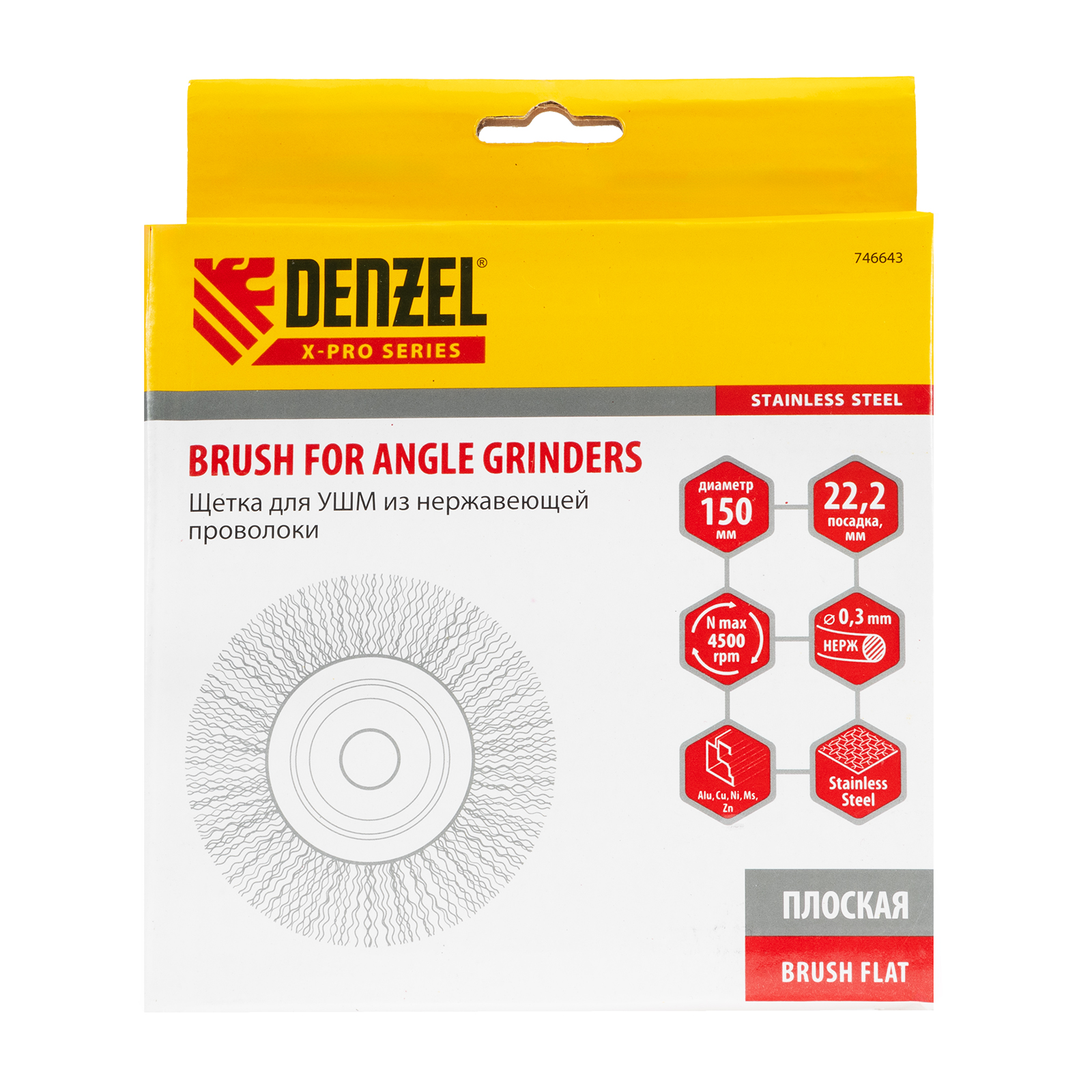 Плоская щетка для УШМ Denzel 746643 диаметром 150 мм, с щетиной из витой нержавеющей проволоки 0,3 мм, с посадкой 22,2 мм, постепенно снимает тонкий слой материала, поэтому ее используют для щадящей обработки металлических, деревянных, пластиковых поверхностей, а также изделий из нержавеющей стали. Щетка удаляет ржавчину, загрязнения, остатки лакокрасочных покрытий из труднодоступных мест, пазов и углов. Оснастка с посадкой 22,2 мм устанавливается на фланец углошлифовальной машины, что удобно для длительной работы без смены насадок. Рекомендуемая максимальная скорость вращения составляет 4500 об/мин. Во время работы следует использовать средства индивидуальной защиты. Щетку применяют в строительстве, машиностроении, а также в быту.