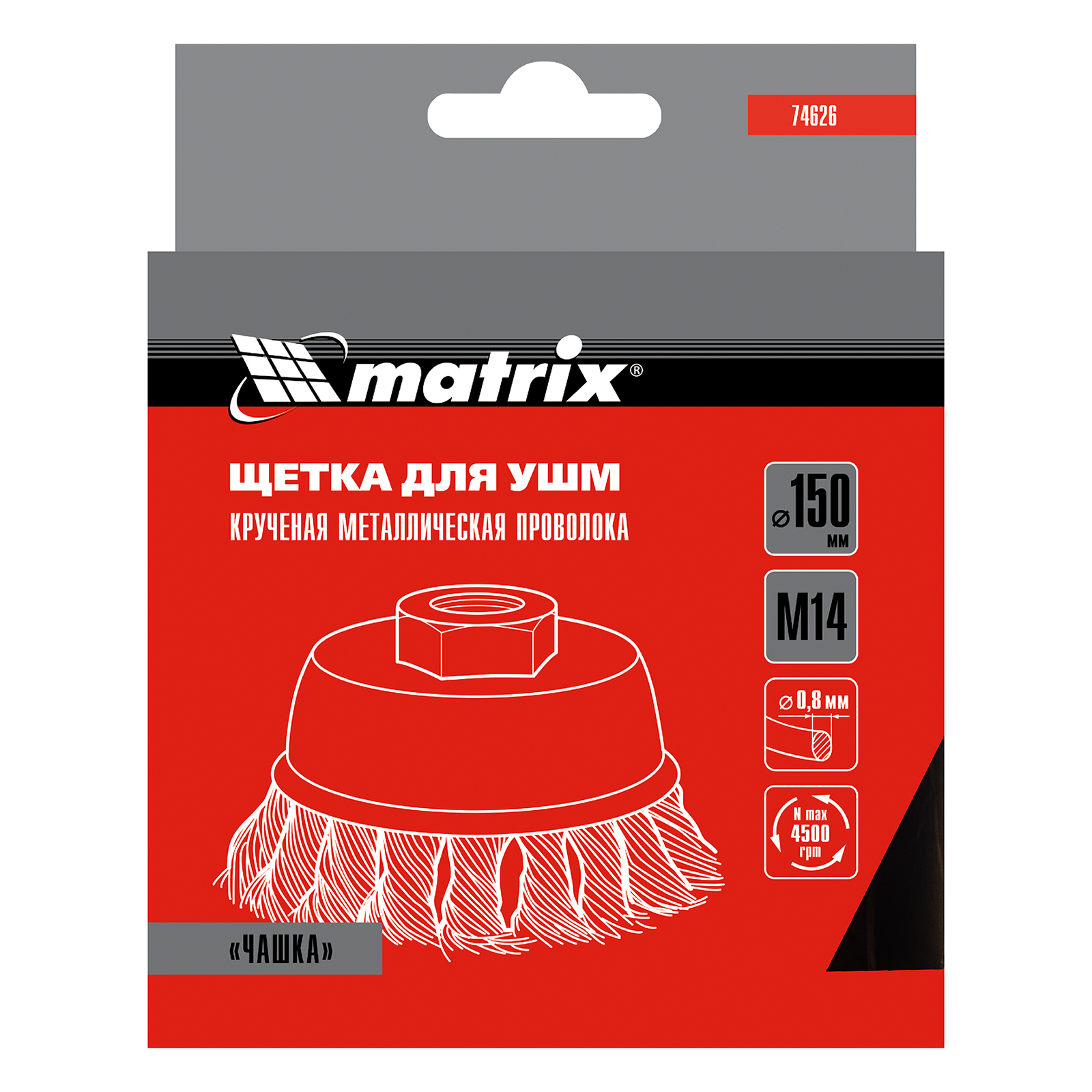 Щетка Matrix «Чашка» 74626 диаметром 150 мм, с присоединительной резьбой М14, с щетиной из крученой проволоки диаметром 0,8 мм, устанавливается на УШМ, поддерживающую работу со скоростью 4500 об/мин. Щетина предназначена для грубой (черновой) обработки поверхностей, более агрессивной по сравнению с щетиной 0,5 мм. Изделие подходит для удаления загрязнений, снятия толстого слоя ржавчины, ЛКМ, зачистки сварных швов.
