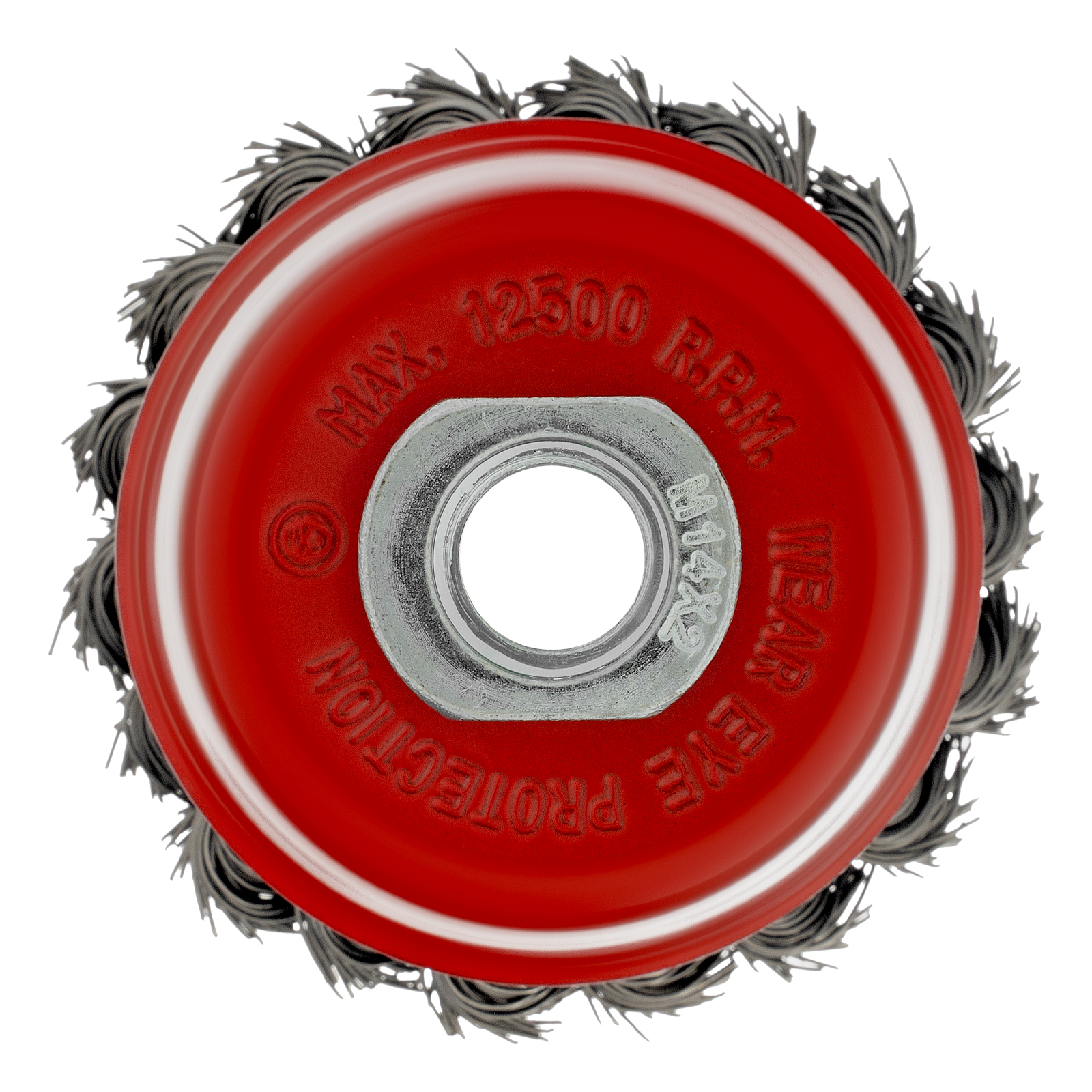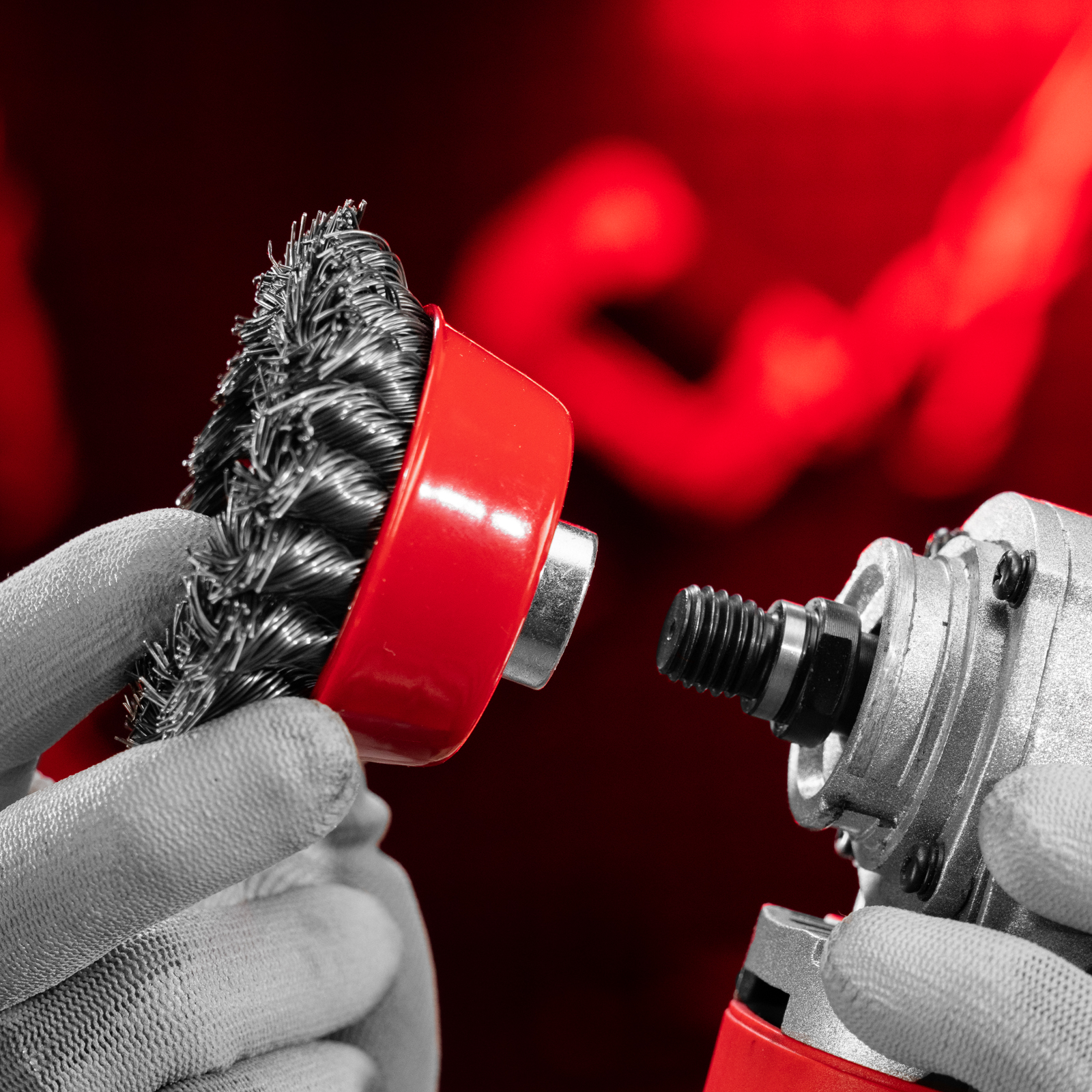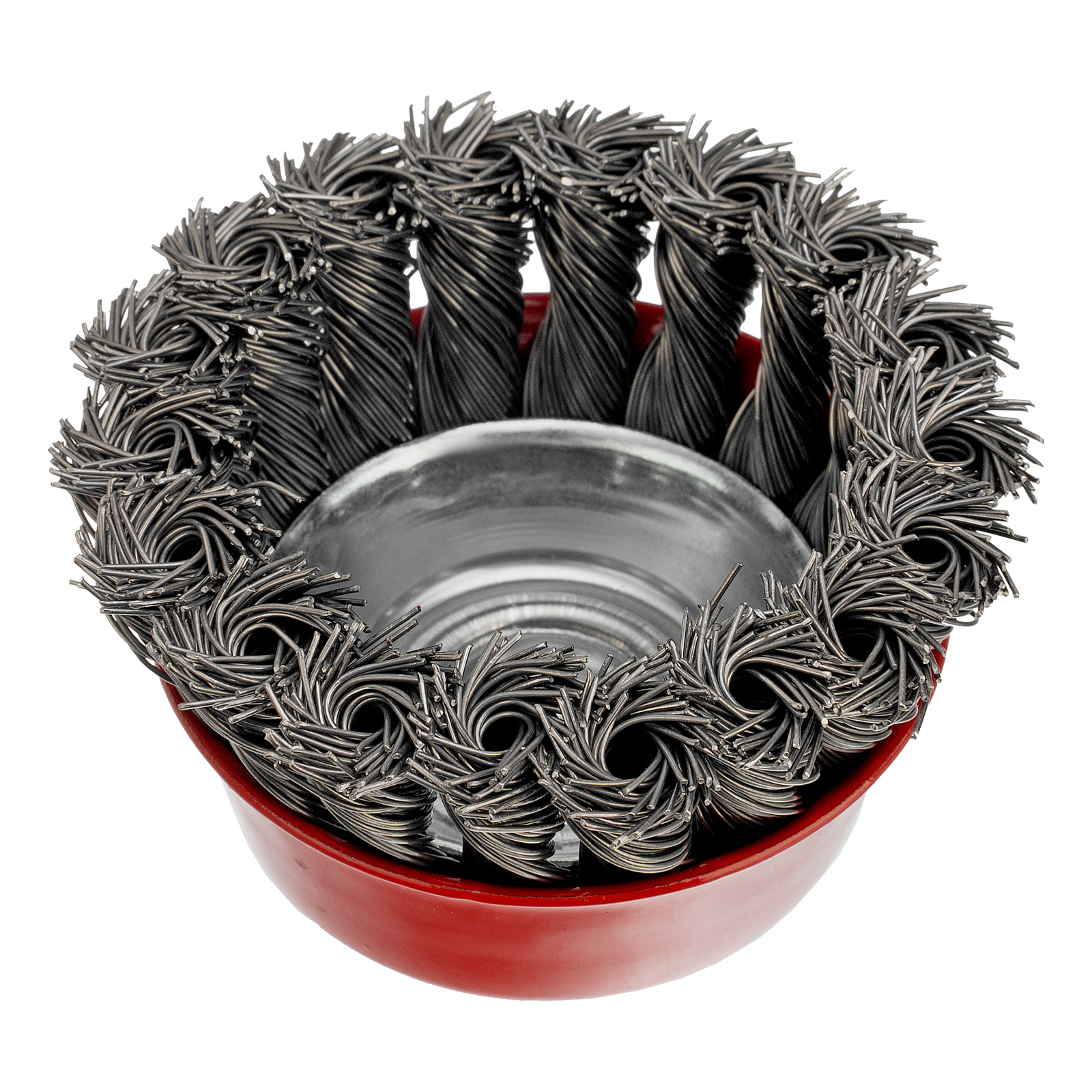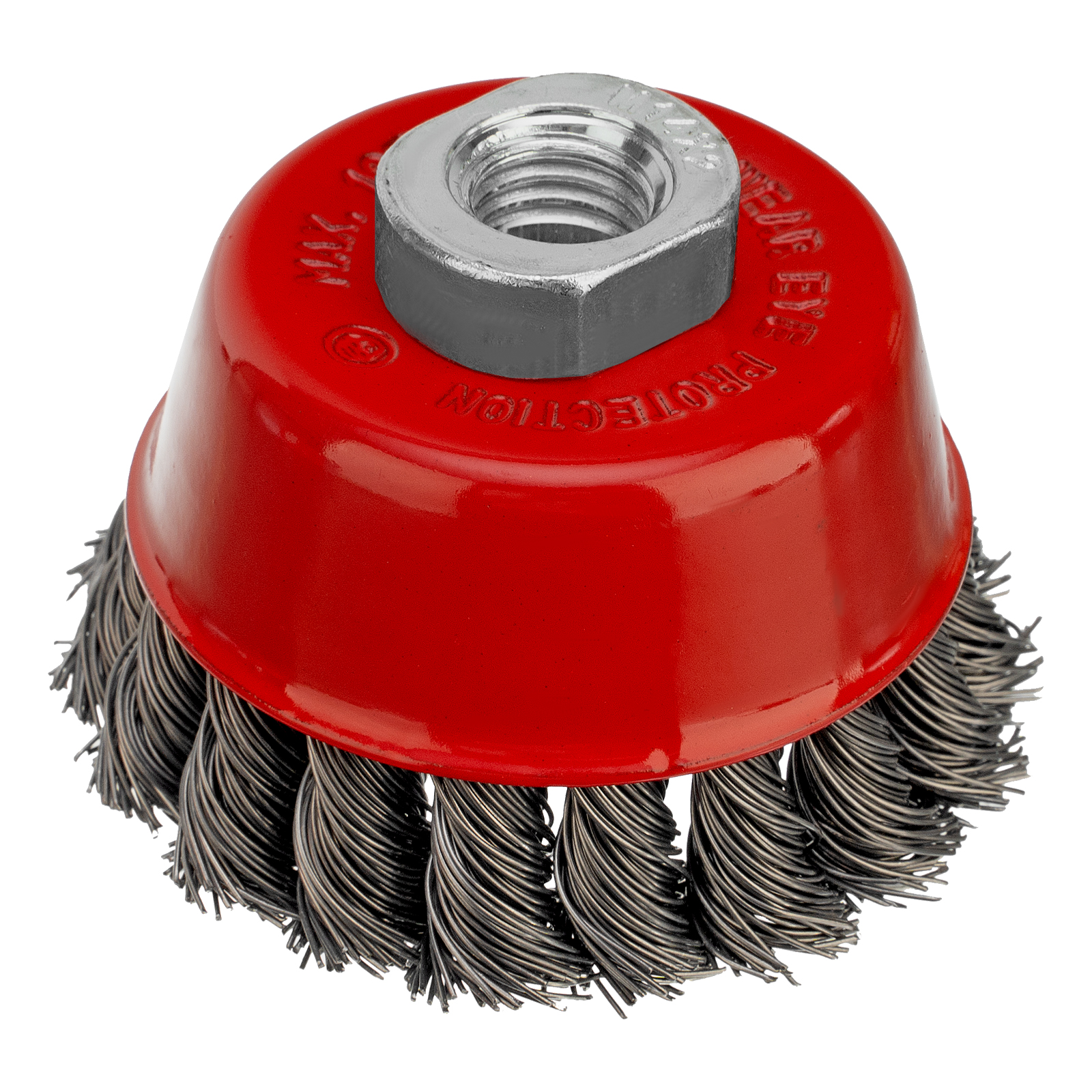 Щетка Matrix «Чашка» 74624 диаметром 75 мм, с присоединительной резьбой М14, с щетиной из крученой проволоки диаметром 0,5 мм, устанавливается на УШМ, поддерживающую работу со скоростью 12500 об/мин. Изделие предназначено для грубой (черновой) обработки поверхностей и подходит для удаления загрязнений, снятия толстого слоя ржавчины, ЛКМ, зачистки сварных швов.