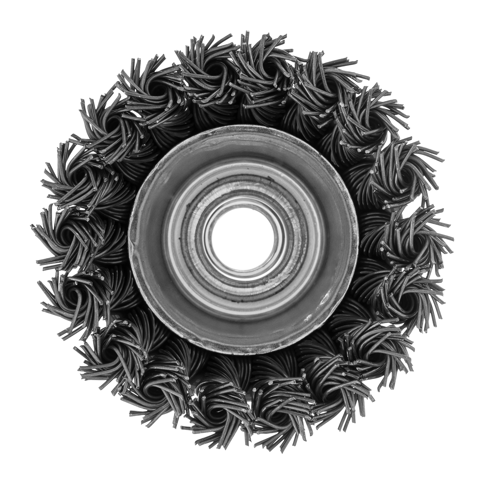 Щетка Matrix «Чашка» 74622 диаметром 75 мм, с присоединительной резьбой М14, с щетиной из крученой проволоки диаметром 0,8 мм, устанавливается на УШМ, поддерживающую работу со скоростью 12500 об/мин. Щетина предназначена для грубой (черновой) обработки поверхностей, более агрессивной по сравнению с щетиной 0,5 мм. Изделие подходит для удаления загрязнений, снятия толстого слоя ржавчины, ЛКМ, зачистки сварных швов.