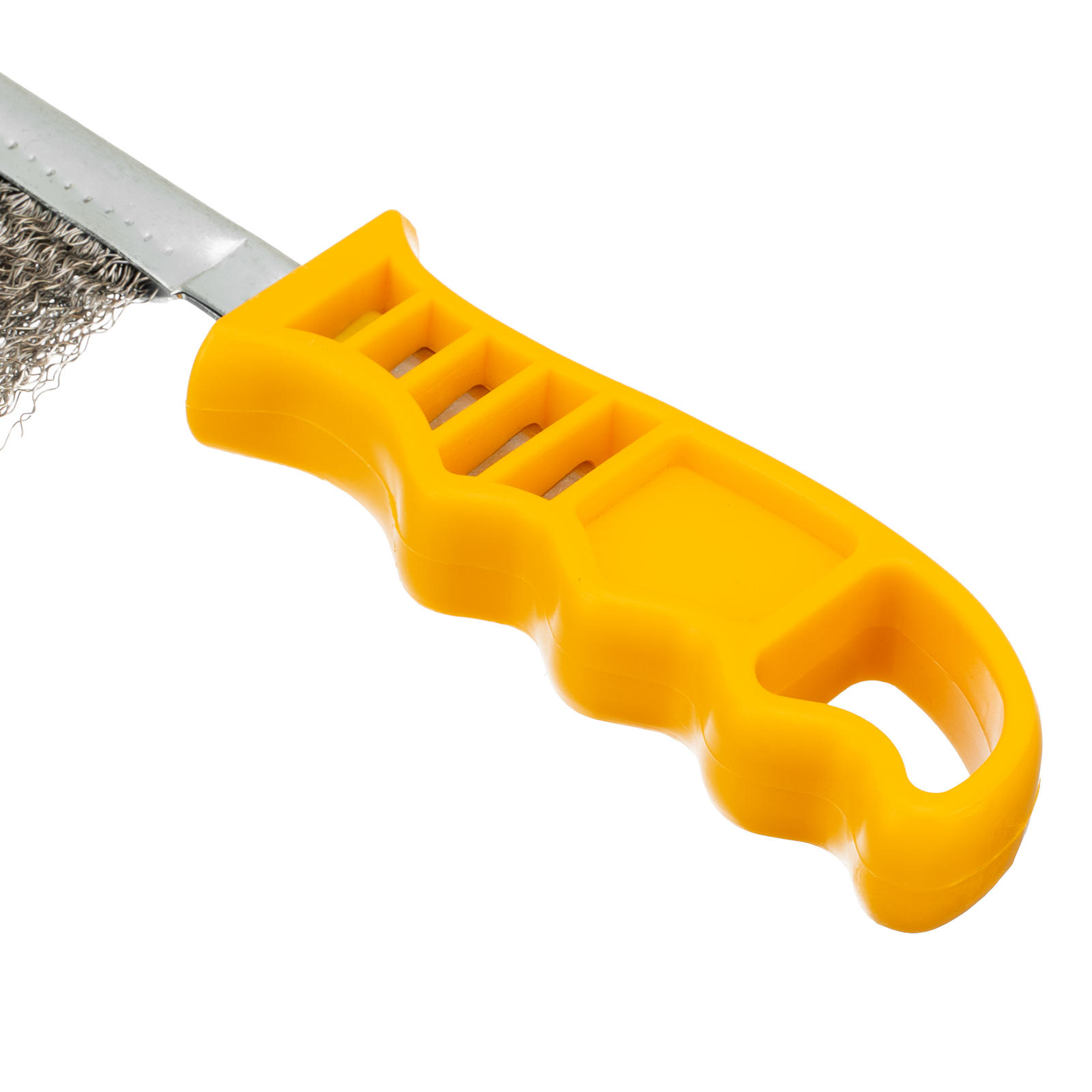 Металлическая зачистная щетка Denzel 748287 с пластмассовой рукояткой и щетиной из нержавеющей проволоки, используется для очищения металлических, деревянных и других поверхностей от ржавчины, загрязнений, остатков лакокрасочных покрытий. Щетина из нержавейки с высокой абразивной способностью обеспечивает эффективность щетки. Благодаря изогнутому корпусу щетка удобна для обработки поверхностей со сложным рельефом. Инструмент пригодится во время строительства, кузовного ремонта, а также на производстве и в быту.