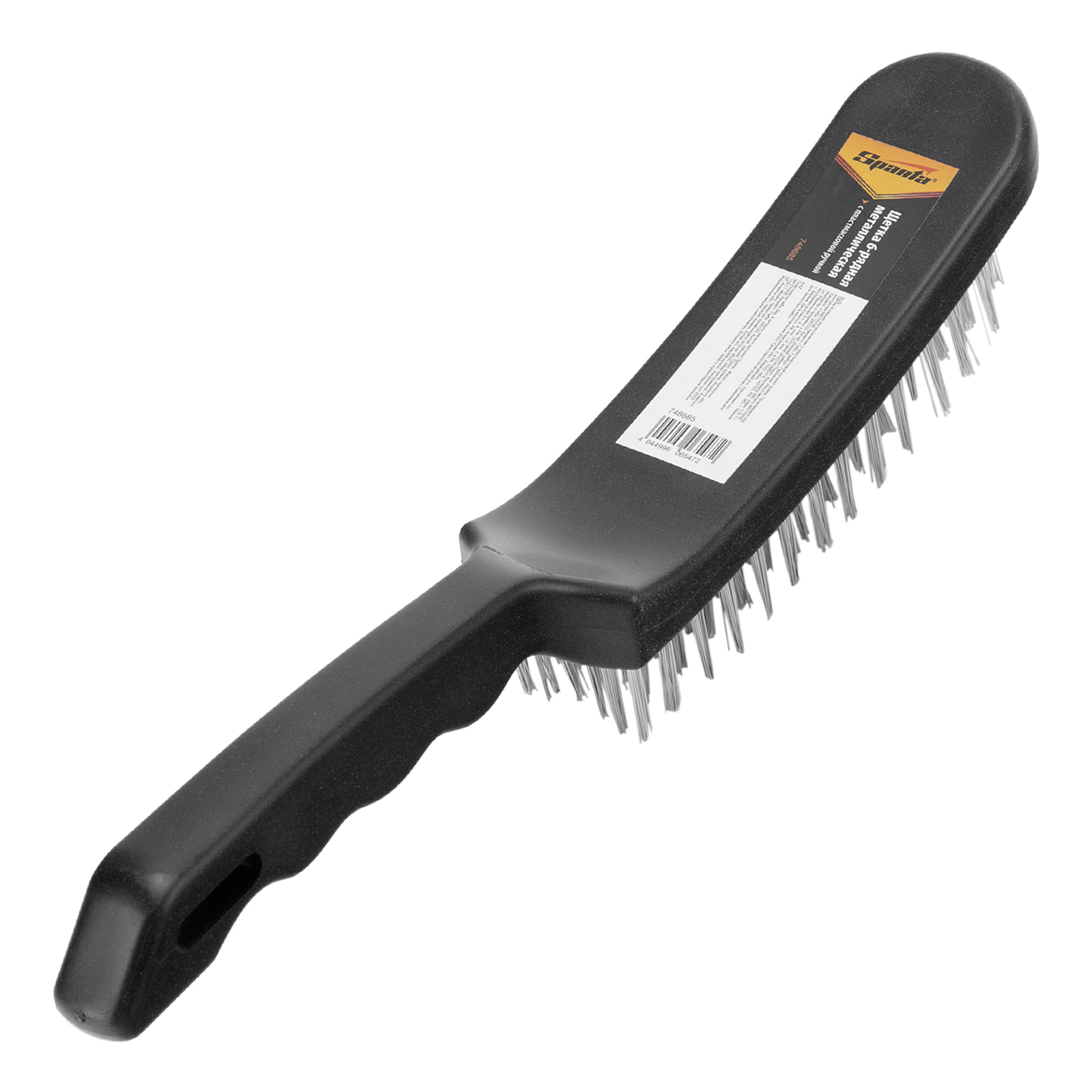 Металлическая шестирядная щетка Sparta 748685 с пластмассовой ручкой используется для обработки металлических, деревянных и других поверхностей. Удаляет загрязнения, ржавчину и старые лакокрасочные покрытия. Пучки проволоки расположены в 6 рядов, что обеспечивает эффективность зачистки. Щетина надежно закреплена в основании и не выпадает во время работы. Щетка будет полезна во время проведения строительных, ремонтных работ, а также пригодится дома или в гараже.
