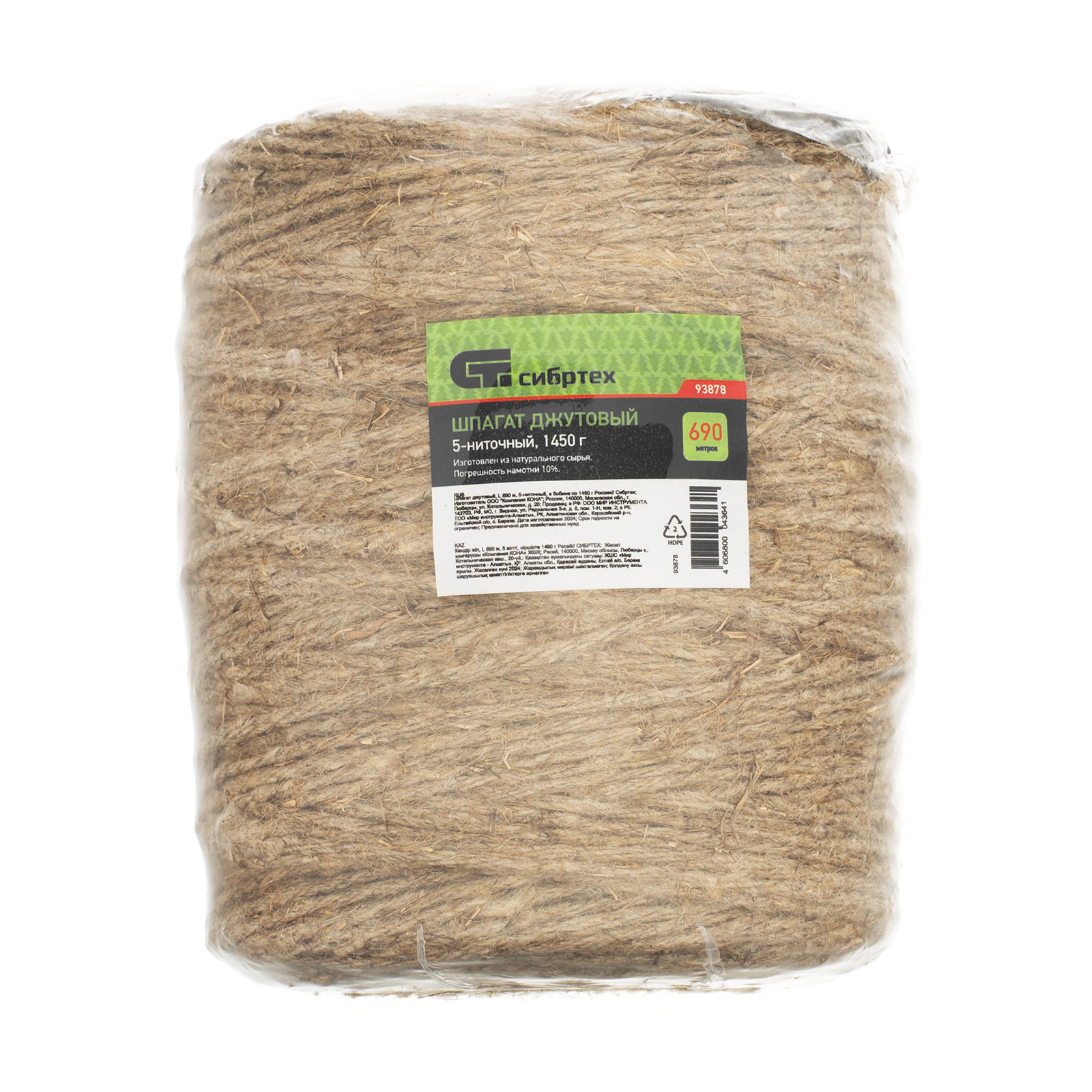 Пятиниточный джутовый шпагат Сибртех 93878 толщиной 2,5 мм и длиной 690 м — обвязочный материал, который применяется для прошивки документов, перевязки, упаковывания или опломбирования различных предметов и оборудования, полезен в банковских, почтовых, архивных организациях, а также в пищевой промышленности и в быту.