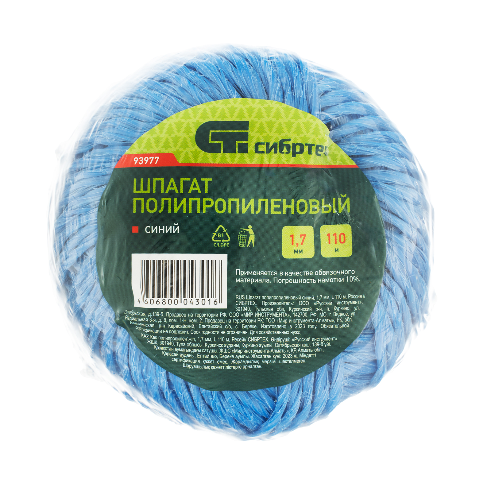 Шпагат полипропиленовый синий, 1.7 мм, L 110 м, Сибртех в Екатеринбурге