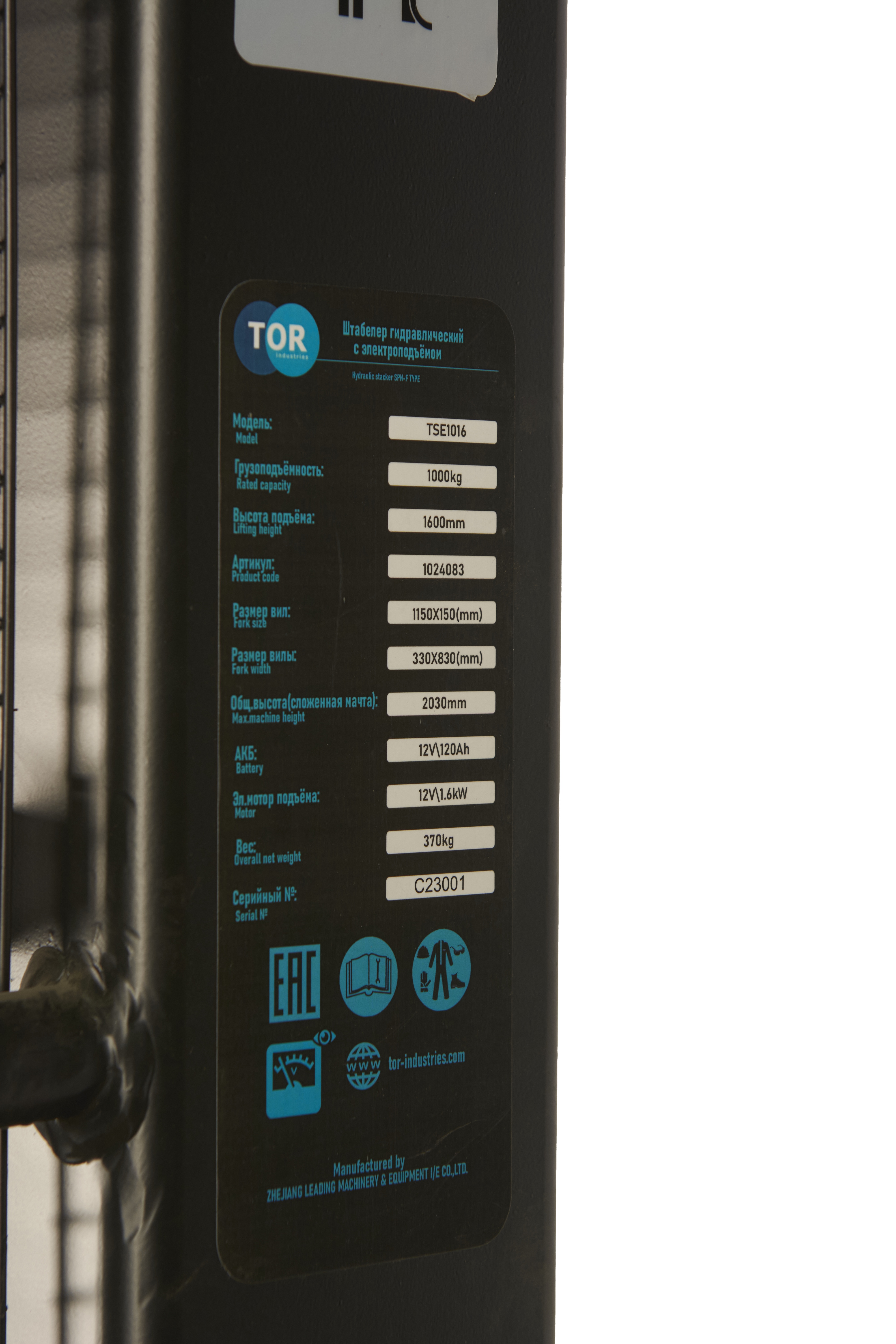 Штабелер гидравлический с электроподъемом 1,0 т 1,6 м TOR TSE1016 в Екатеринбурге