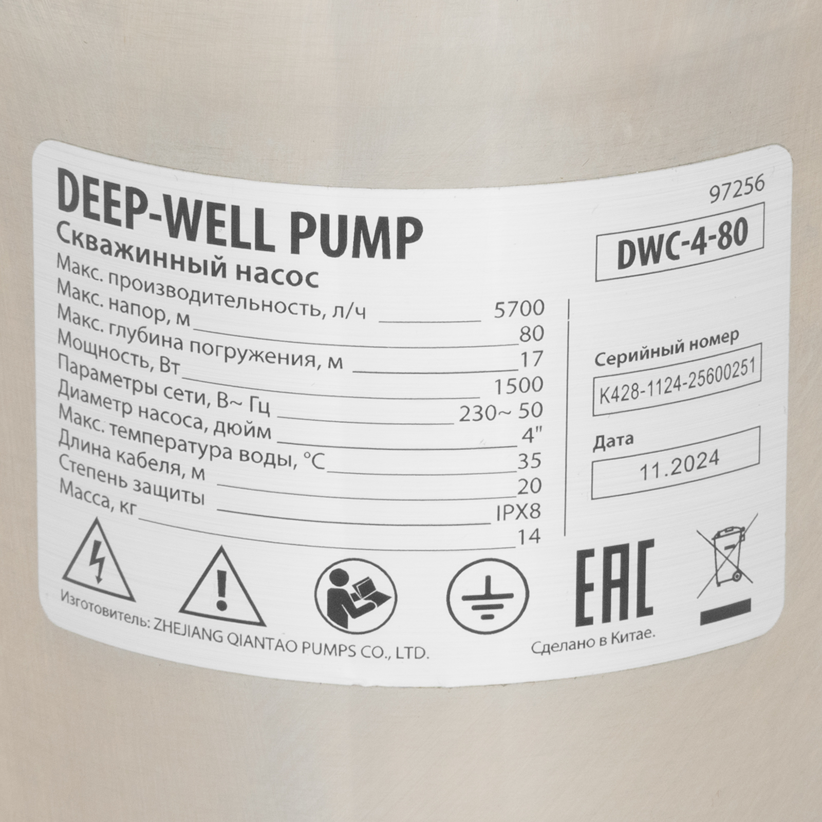 Скважинный насос Denzel DWC-4-80 97256 производительностью 5700 л/ч, диаметром 4″ и мощностью 1500 Вт обеспечивает напор до 80 м. Предназначен для подачи чистой воды из скважин, колодцев, систем водоснабжения, различных накопителей и пресных водоемов с глубины до 17 м (с наращиванием кабеля — до 80 м). Насосная часть из 11 центробежных импеллеров обеспечивает повышенную производительность, что позволяет организовать не только полив приусадебных участков, но и бытовое водоснабжение.