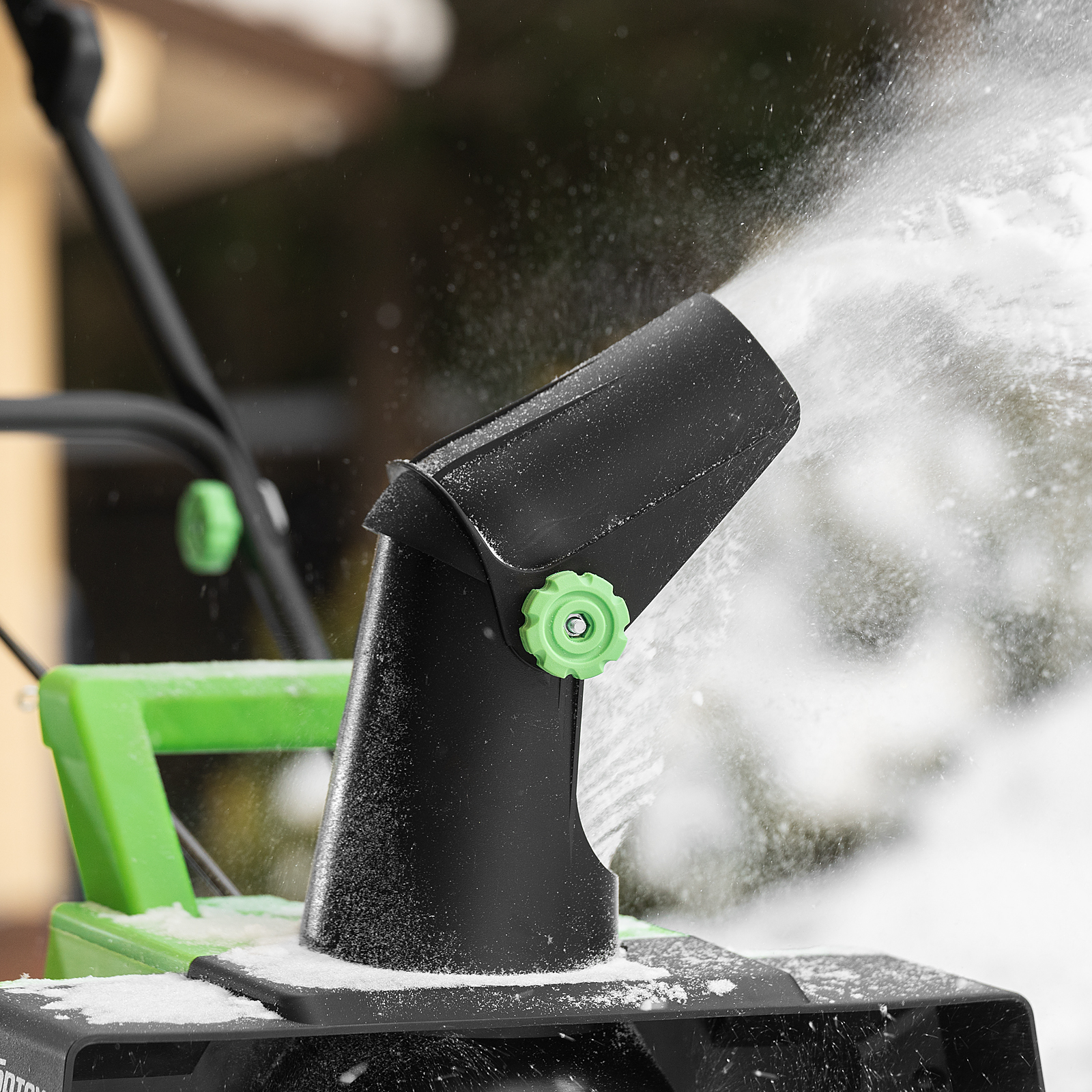 - Эффективная работа — в зависимости от размера территории можно установить дальность выброса снега до 6 м, а также отрегулировать угол поворота выпускного желоба в пределах 180°.