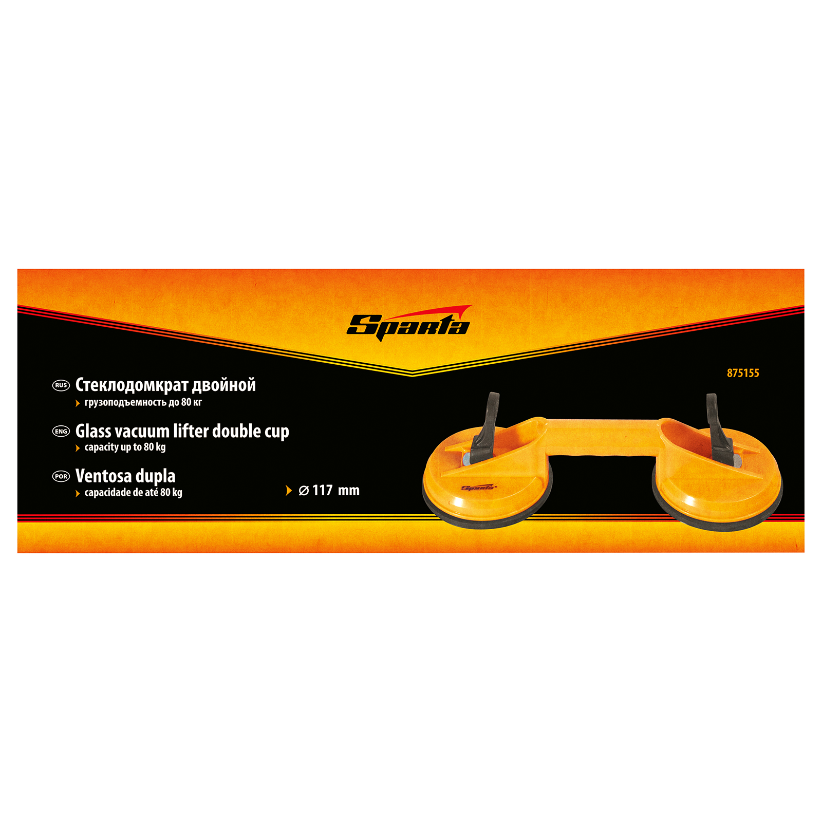 Двойной стеклодомкрат Sparta 875155 предназначен для удержания, переноски и установки зеркал, стекол, столешниц, кафельной плитки и других плоских гладких предметов массой до 80 кг. Две вакуумные присоски бережно, но надежно фиксируются на поверхности при помощи зажимов. Стеклодомкрат будет полезен во время проведения ремонта, а также пригодится в быту.
