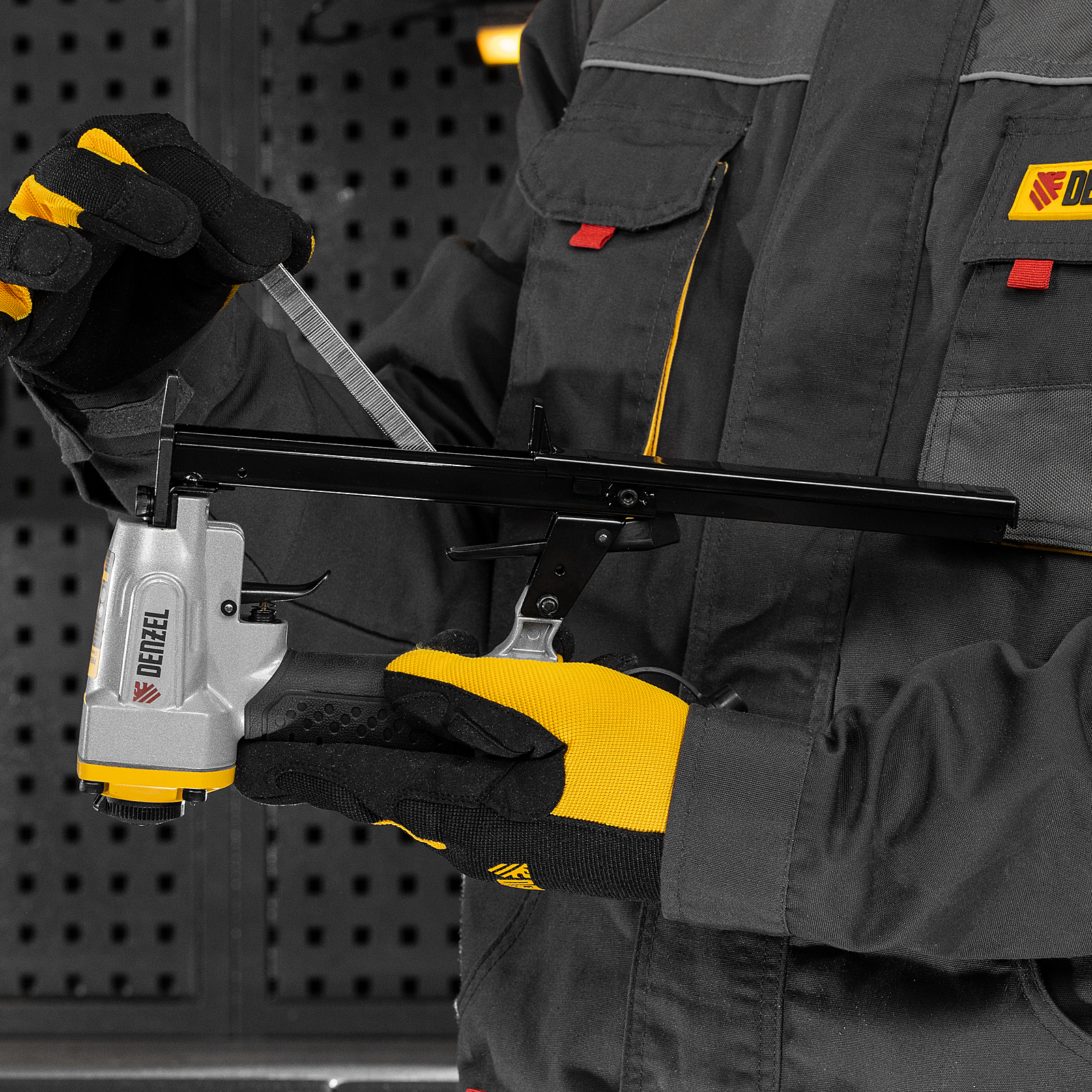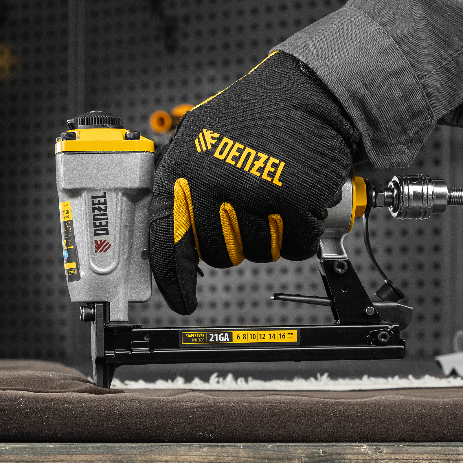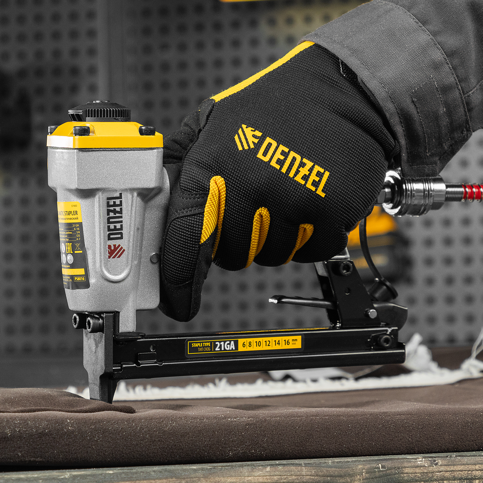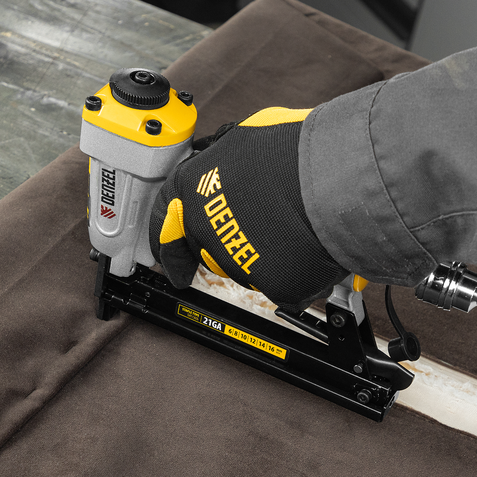 Пневматический степлер Denzel PS8016 57400 предназначен для крепления к основанию листовых материалов при помощи прямоугольных скоб 21GA размером 6-16 мм. Подходит для закрепления фанеры, оргалита, ДСП, обивочной ткани. Незаменим во время отделочных работ и производства мебели.